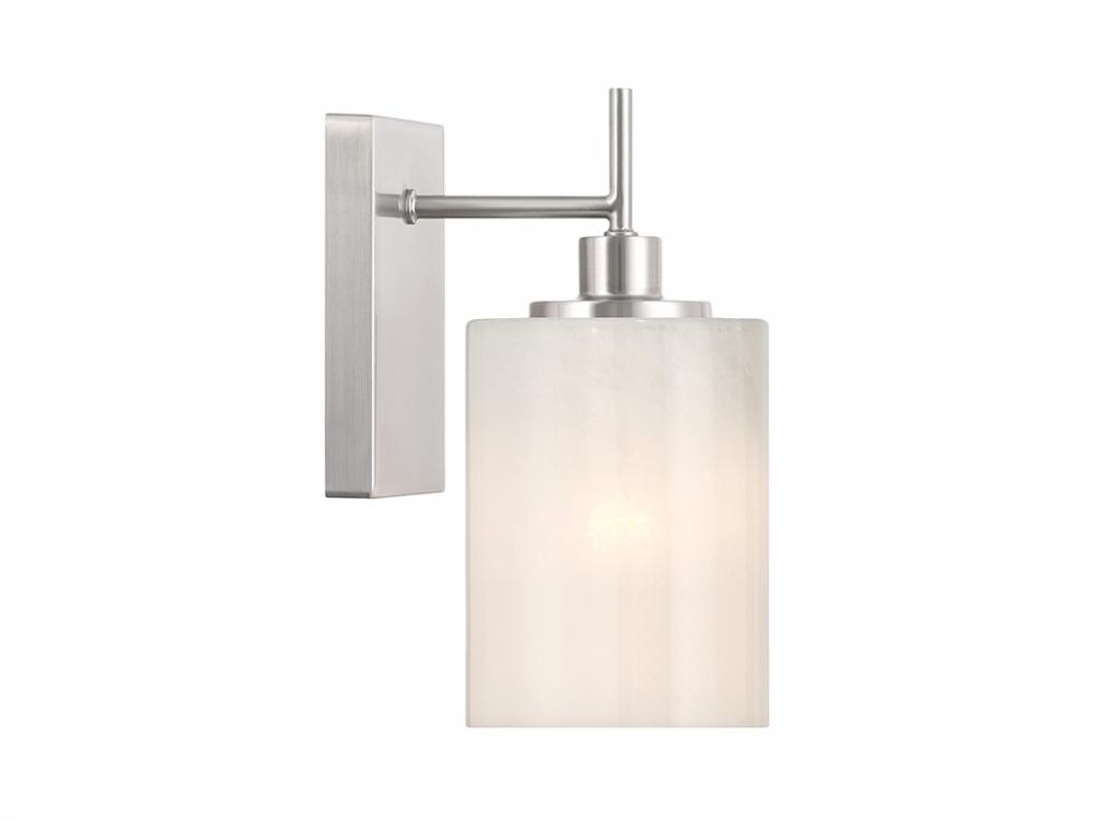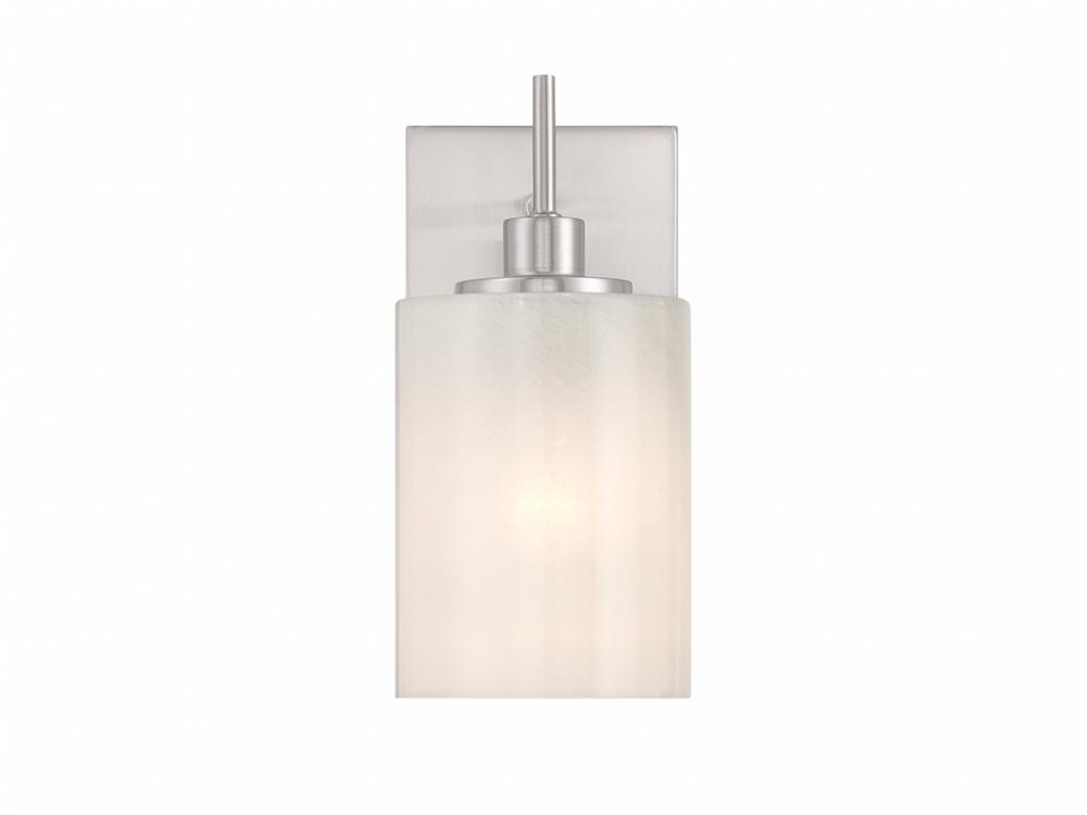 Pep up any room with this simply beautiful 1-light sconce! Its centerpiece is a shade of strie glass featuring dazzling swirls that draw the eye, soften the glow and work beautifully with the Brushed Nickel finish. It is 9.75" in height, 4.75" in width and extends 6.5" from the wall. Uses 1 standard size bulb of up to 60 watts. Bulb not included.