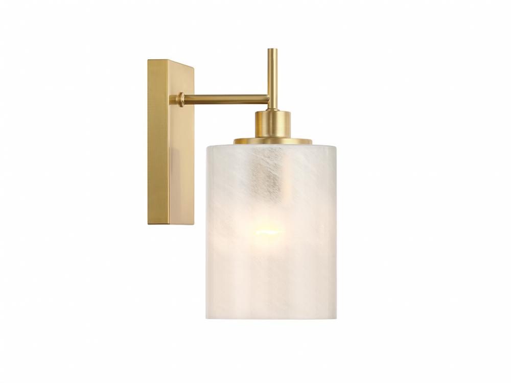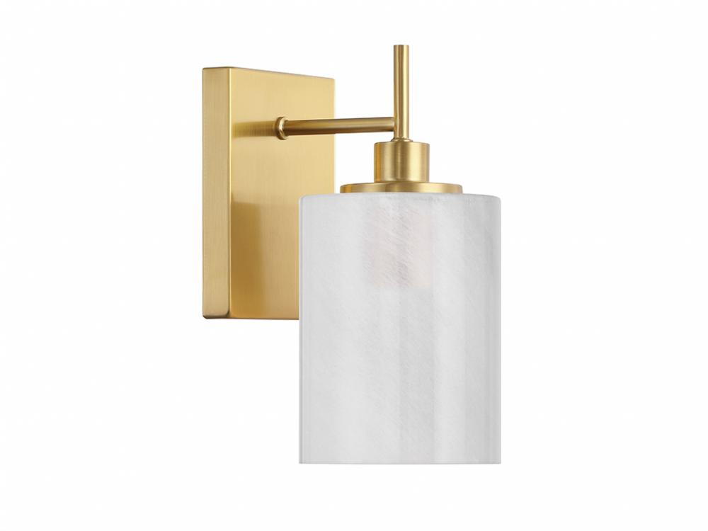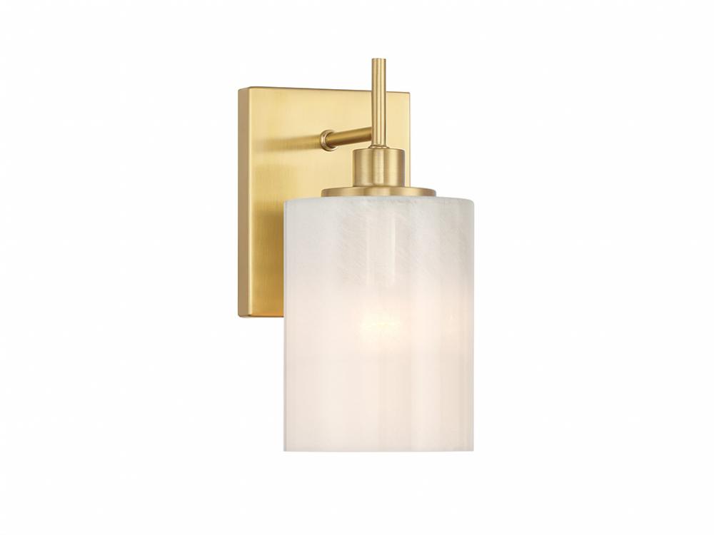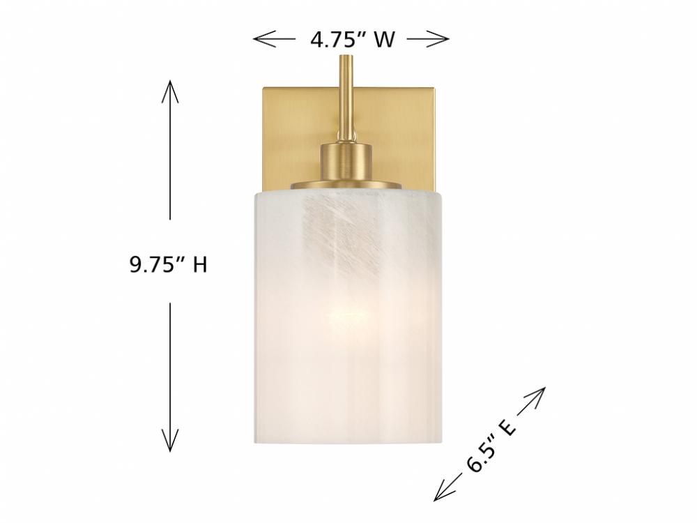 Pep up any room with this simply beautiful 1-light sconce! Its centerpiece is a shade of strie glass featuring dazzling swirls that draw the eye, soften the glow and work beautifully with the Natural Brass finish. It is 9.75" in height, 4.75" in width and extends 6.5" from the wall. Uses 1 standard size bulb of up to 60 watts. Bulb not included.