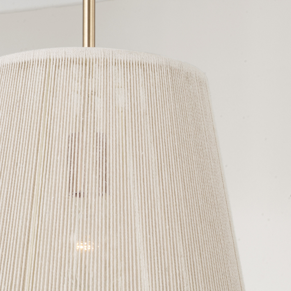 A casual twist on classic style, the Tara Small Tapered Pendant seamlessly blends a timeless silhouette with hand-wrapped Bleached Natural Rope to create a visually soft, stunning luminaire. The Matte Brass finish adds a touch of warmth and shine.