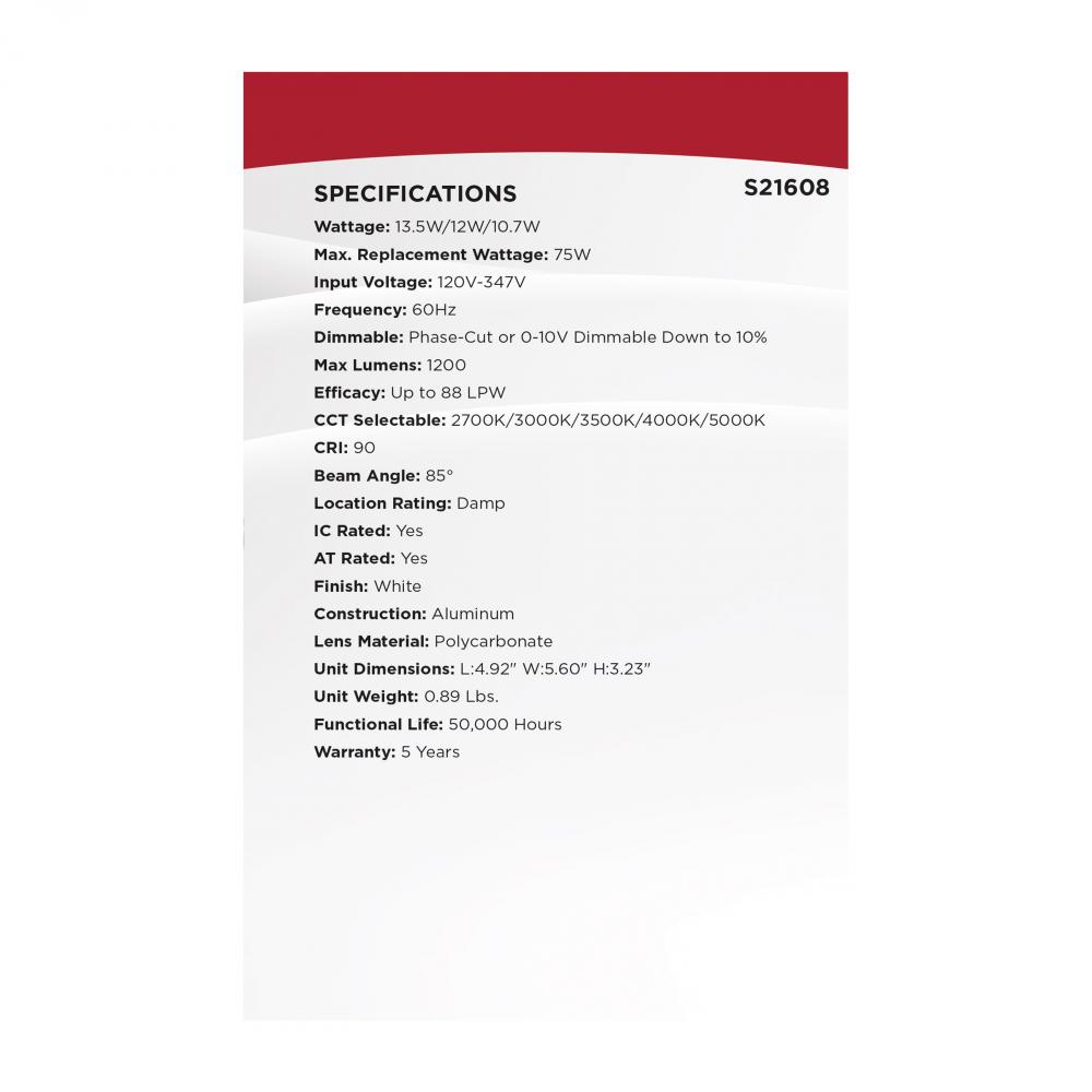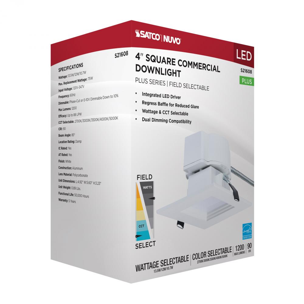 SATCO NUVO's Plus Series LED Commercial Downlight, S21608, delivers exceptional performance and versatility for today's remodel or new construction commercial environments. This 4-inch square fixture features field-selectable wattage and CCT settin