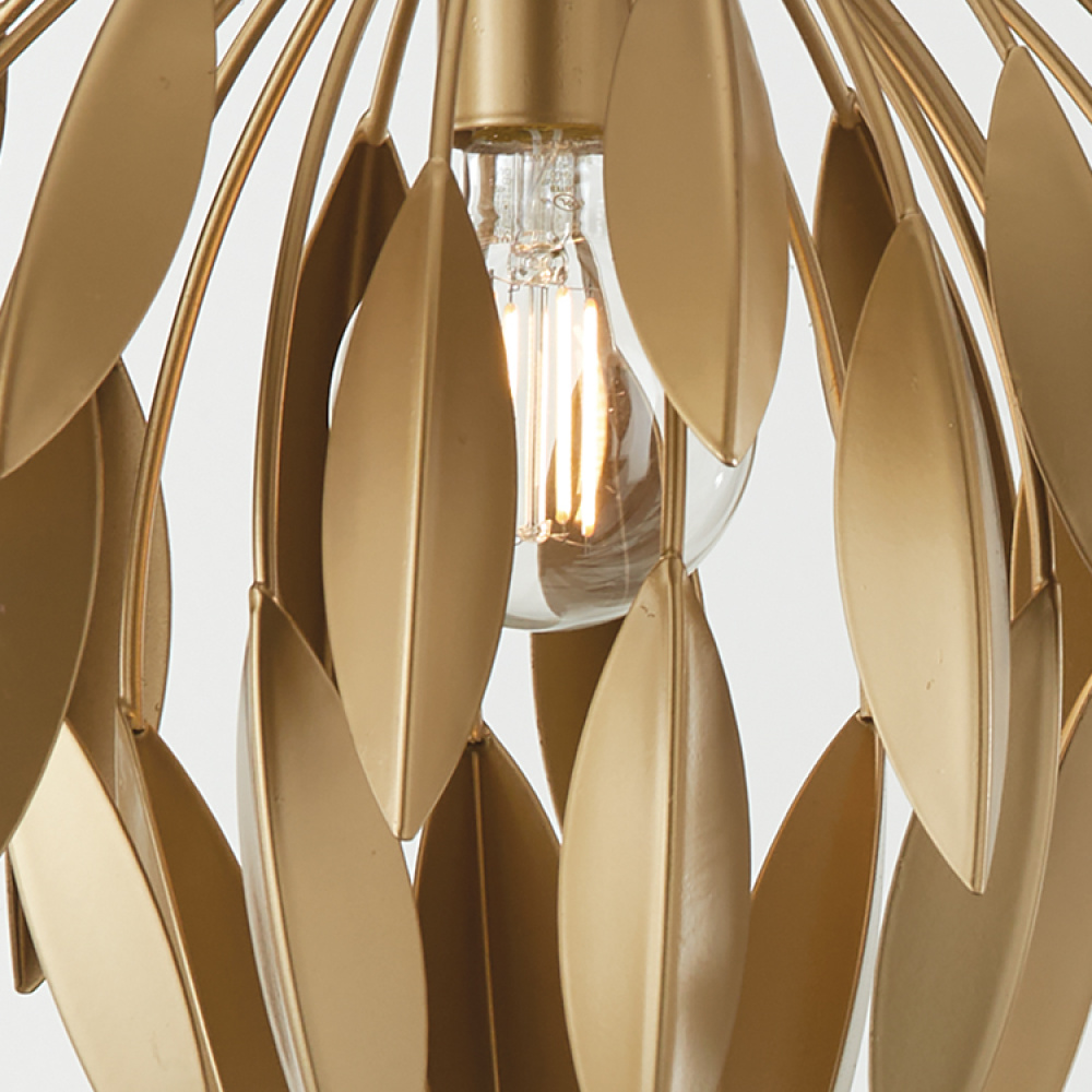 DETAILS: Delicate, pointed metal flower petals surround Soft White glass globes, bringing botanical ambiance with a warm, Buffed Gold finish.