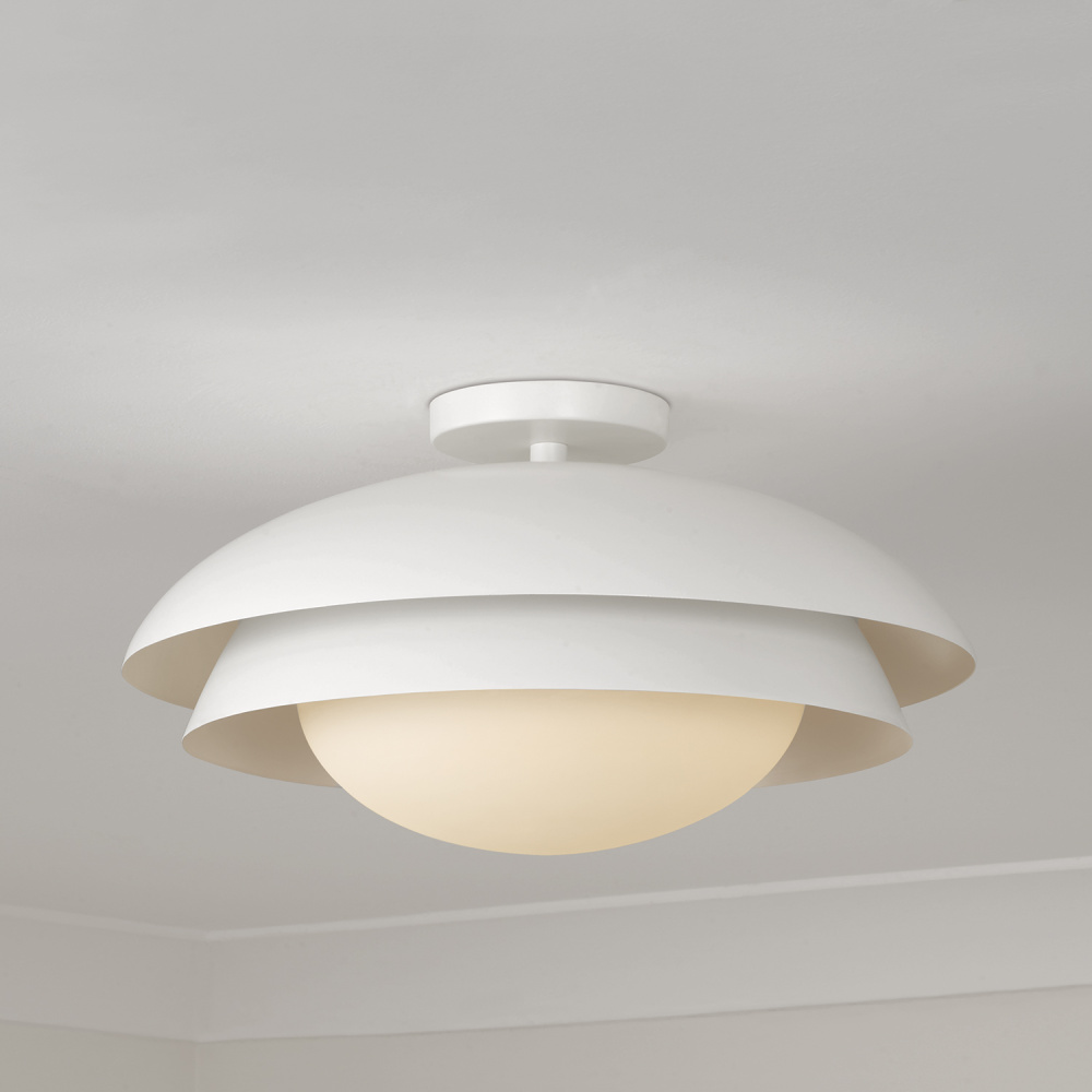 With a nod to Scandinavian style, the Jensen Semi-Flush highlights smooth, metal forms and a calming hue. The matte White finish beautifully complements the geometric nestled domes, while the Soft White glass globe creates a serene illumination.