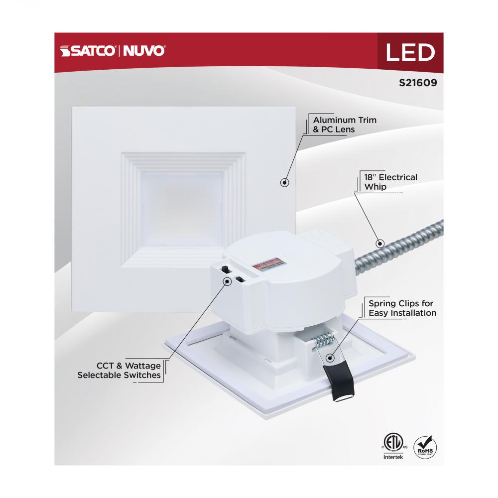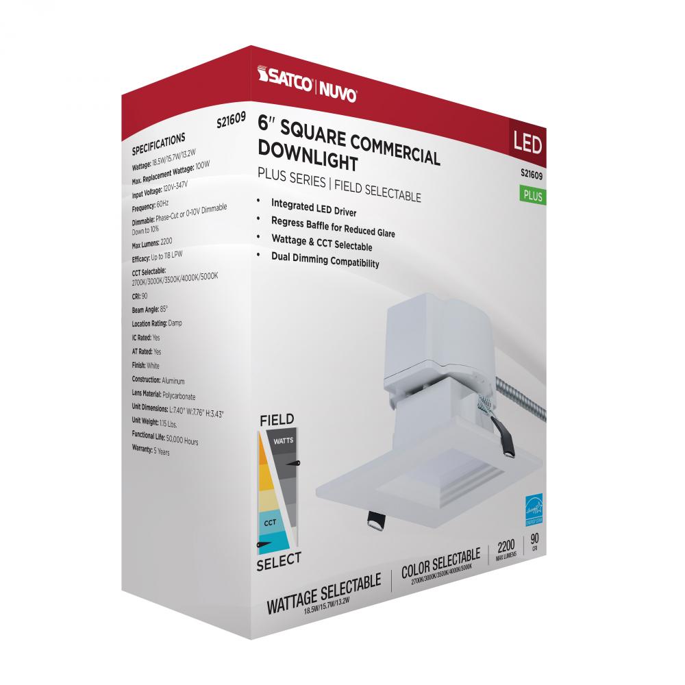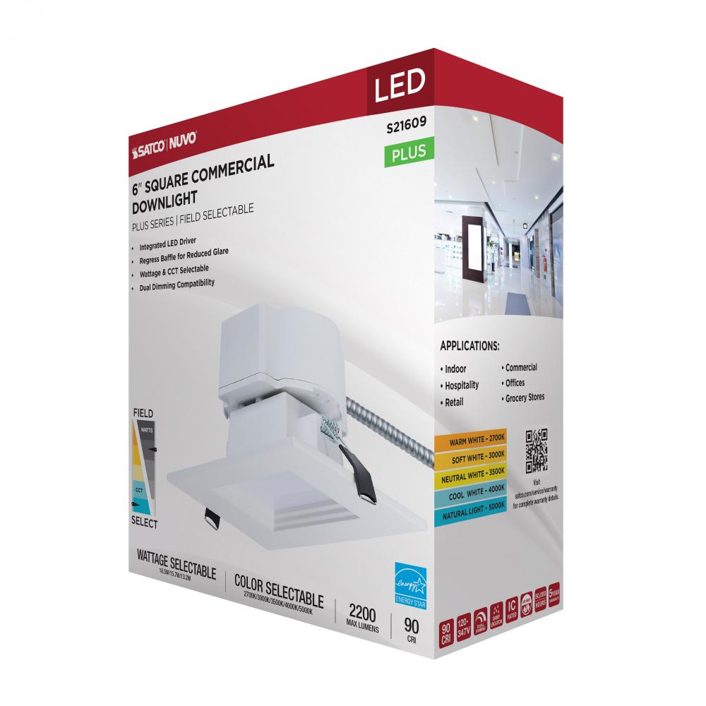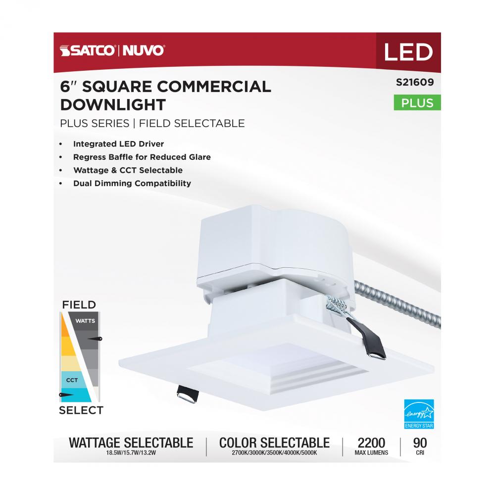 SATCO NUVO's Plus Series LED Commercial Downlight, S21609, delivers exceptional performance and versatility for today's remodel or new construction commercial environments. This 6-inch square fixture features field-selectable wattage and CCT settin