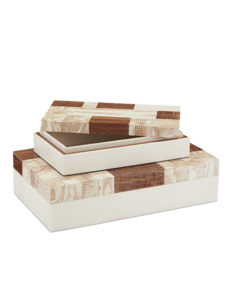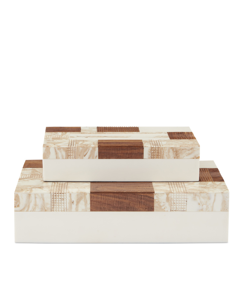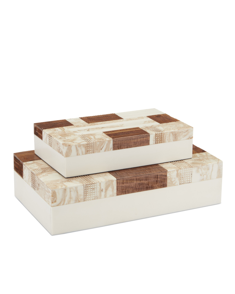 A surprising mix of materials makes up the 1940s Box Set. Covering the surface of the pair of tan and ivory decorative boxes are wood, composite, and linen. The wood tones add warmth, the composite brings coolness, and the linen adds texture to the overall composition.