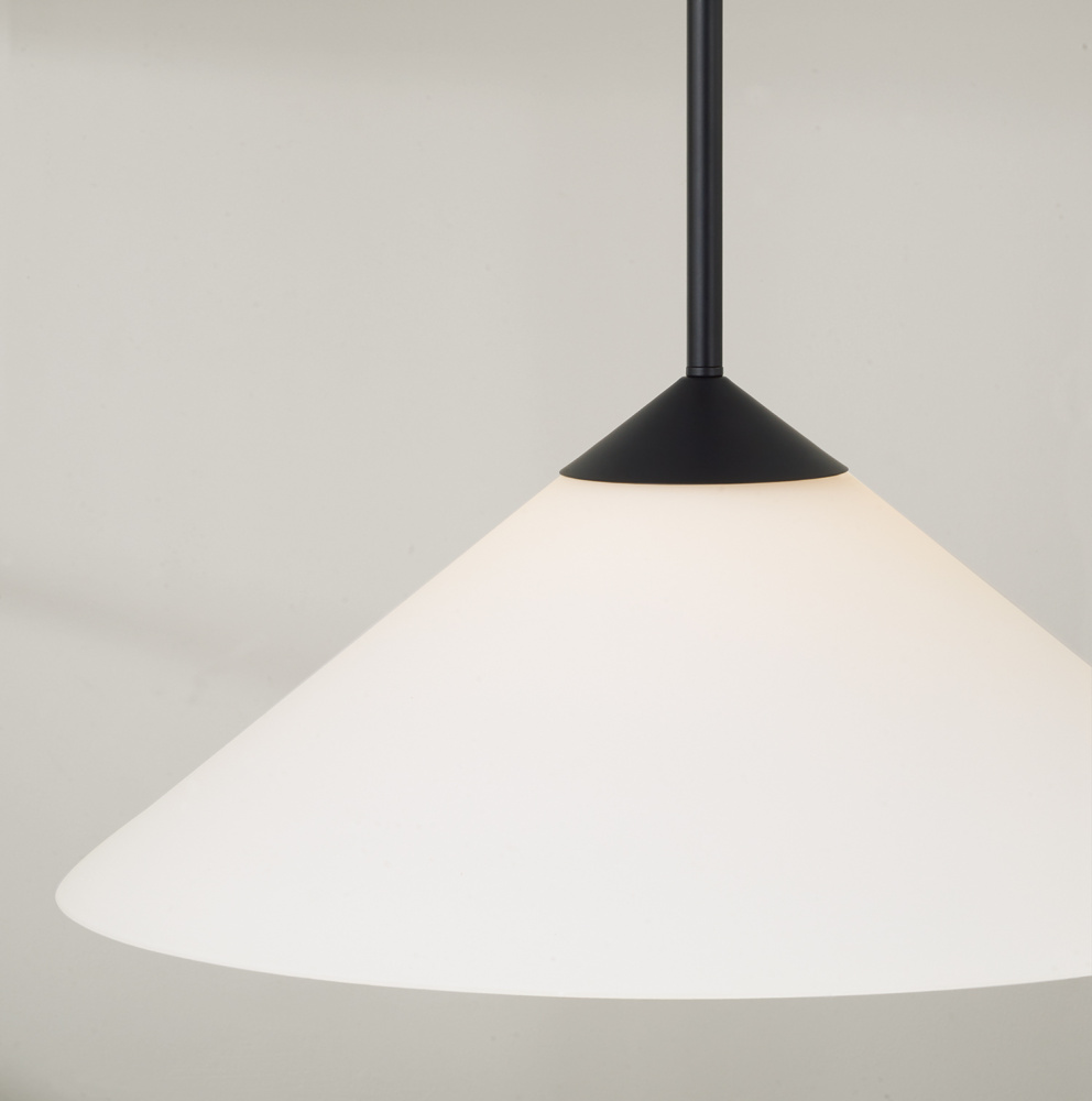 The classic cone shape gets an update with sleek lines and designer details. Paired with the Matte Black finish, the Soft White glass gives an ambient glow to the crisp silhouette of the Gatsby Pendant — complete with a tapered canopy for elevated style.