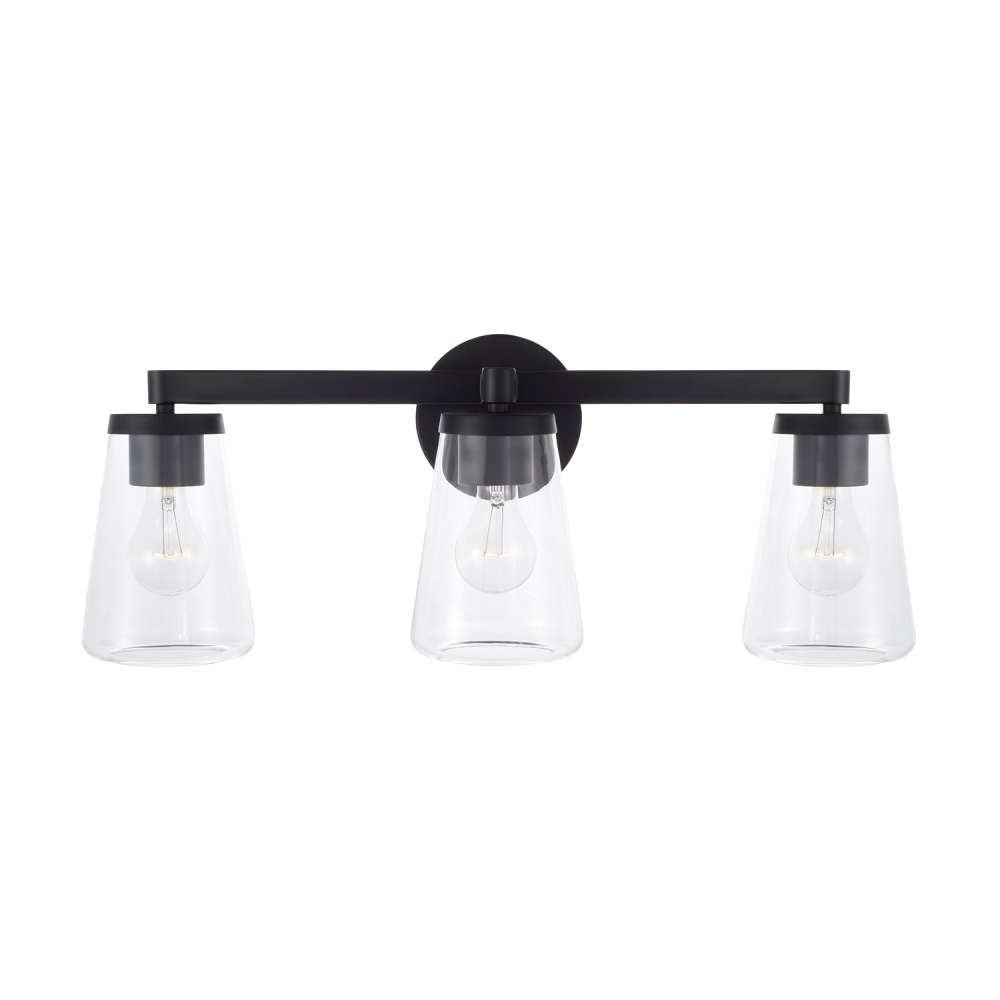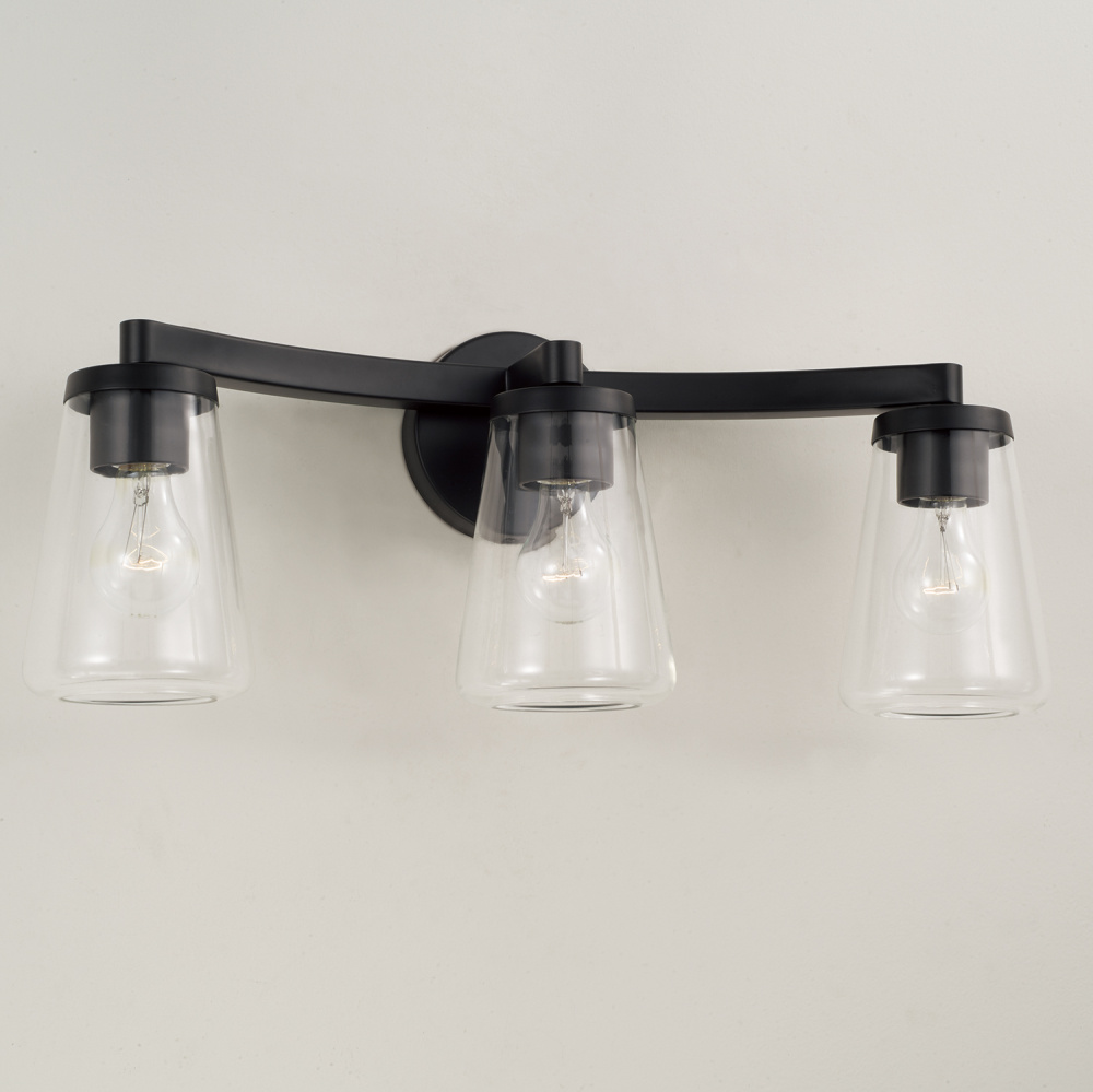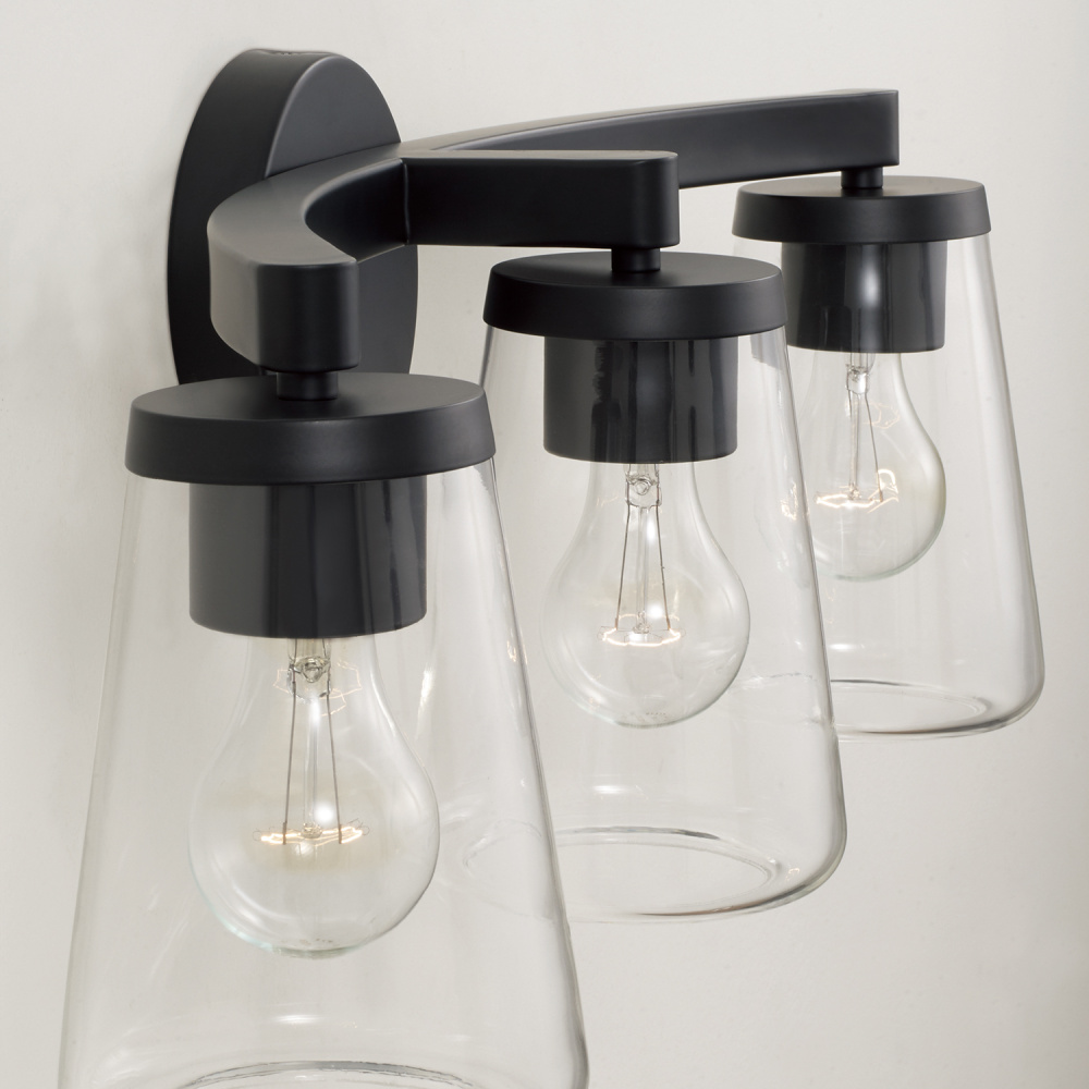 A graceful, curved arm and clear glass create the Aaron 3-Light Vanity for HomePlace. The tapered cylindrical shades bring refined style with optimal light output, while the Matte Black finish punctuates the classic silhouette. Also available in a 2-Light.