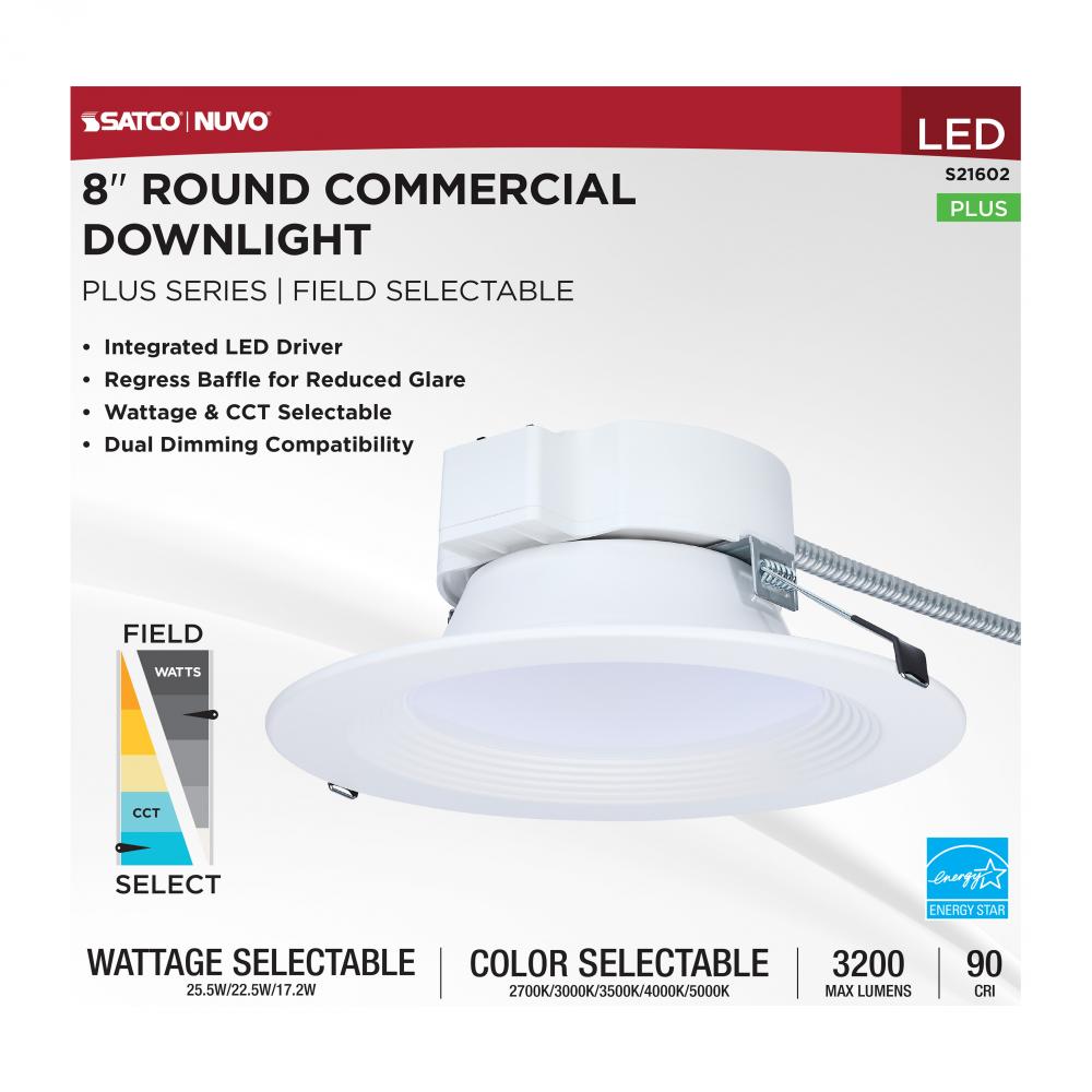 SATCO NUVO's Plus Series LED Commercial Downlight, S21602, delivers exceptional performance and versatility for today's remodel or new construction commercial environments. This 8-inch round fixture features field-selectable wattage and CCT setting