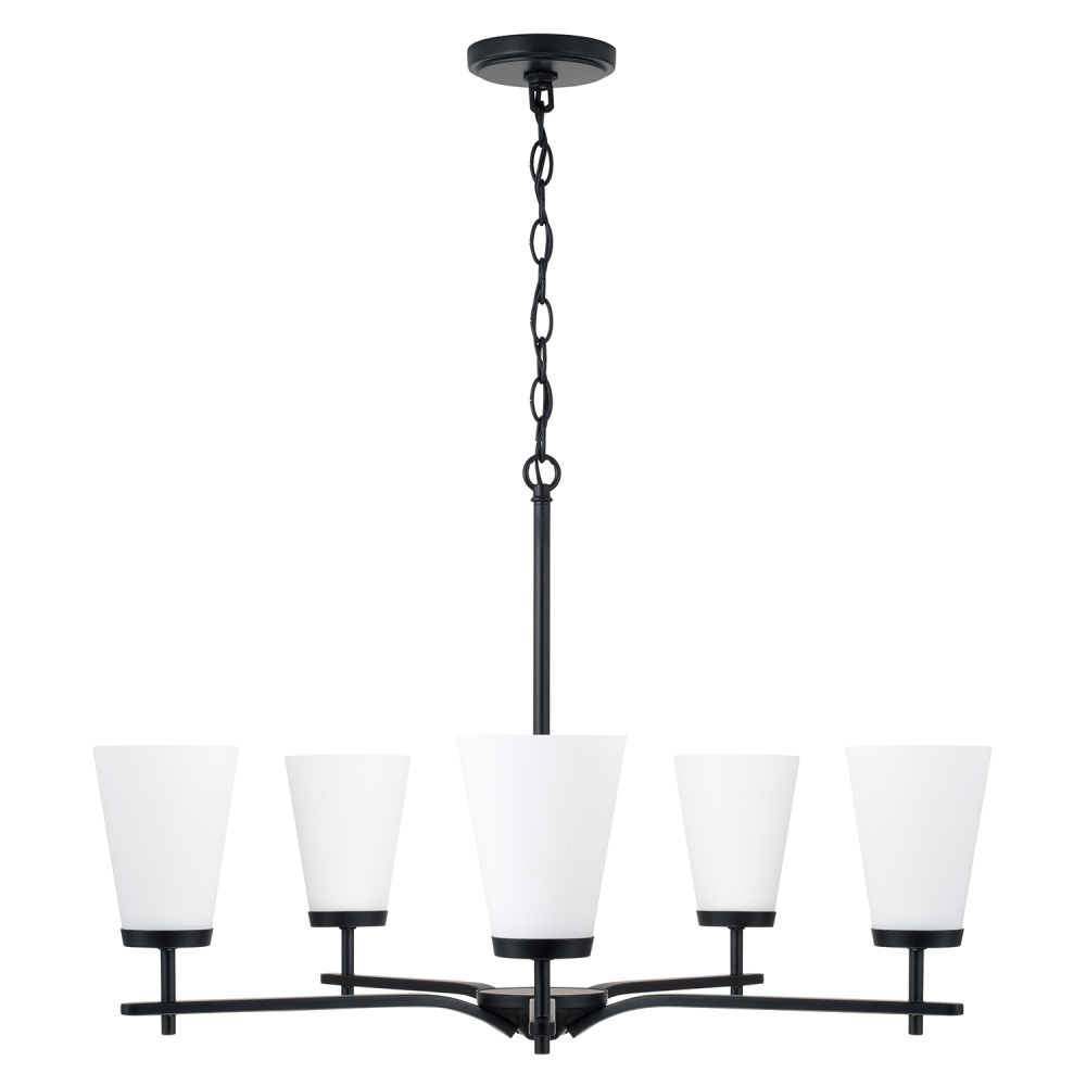 The Drake 5-Light Small Chandelier for HomePlace brings clean and classic style to any space. Paired with sleek, intersecting arms, the tapered Soft White glass shades create an ambient glow, finished in Matte Black for contemporary style.