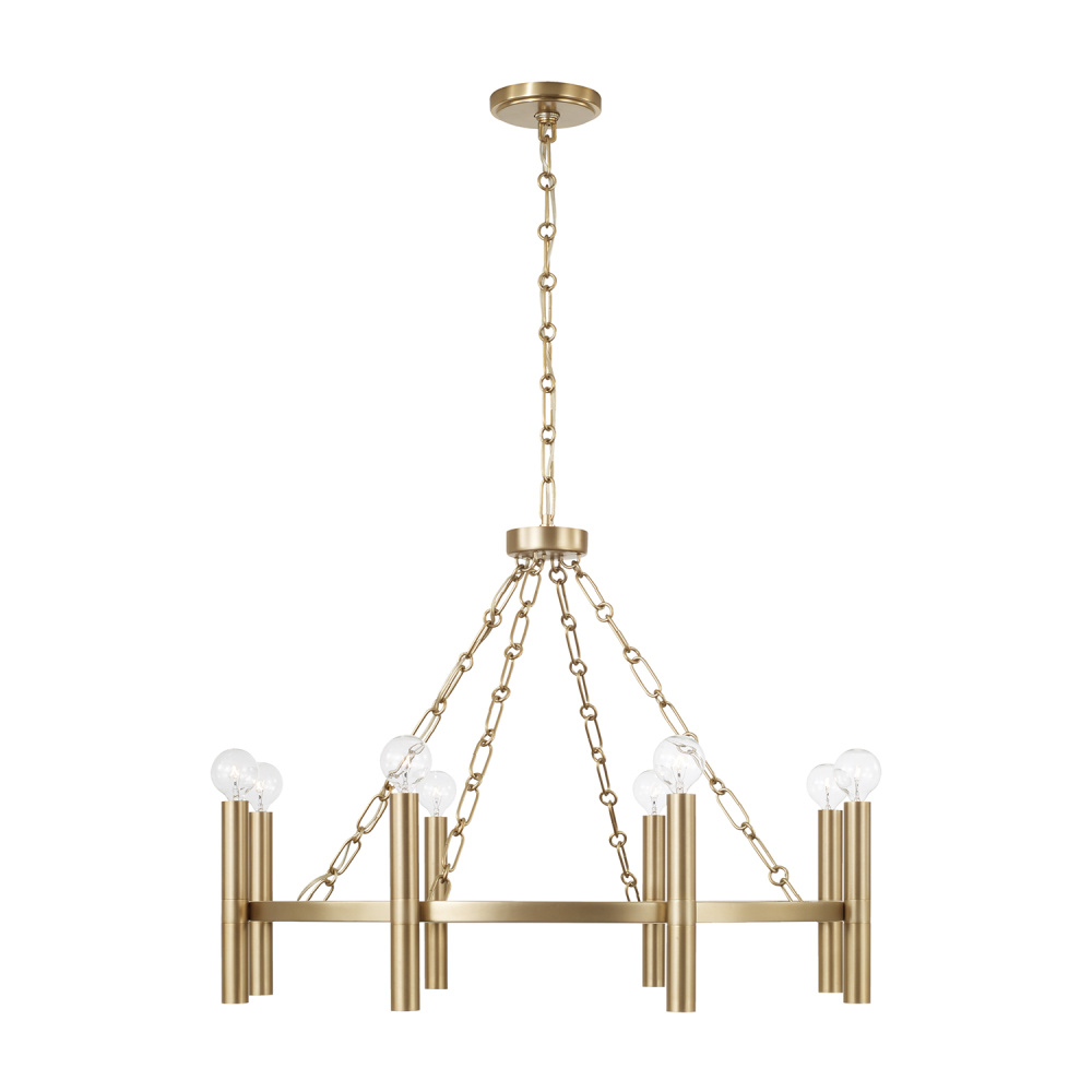 A classic ring silhouette and designer details create the Winton Small Chandelier. Placed on the outside of the frame, the candle sleeves extend beyond the bottom of the ring, held by alternating loop chains for a unique take on the traditional style. The Matte Brass finish offers a beautiful hint of shine.