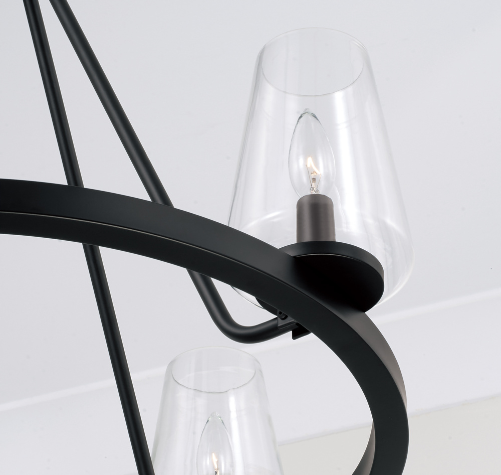 Classic curves and clear glass create the Aaron 4-Light Small Chandelier for HomePlace. The tapered cylindrical shades bring refined style with optimal light output, while the Matte Black finish punctuates the ring silhouette. Also available in a 6-Light.