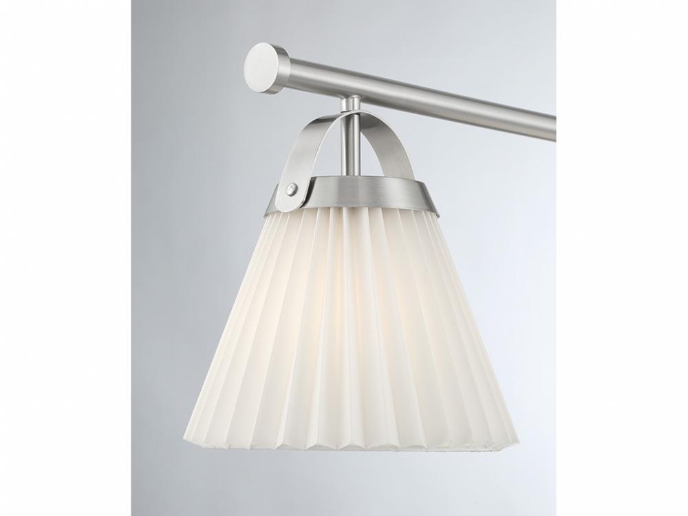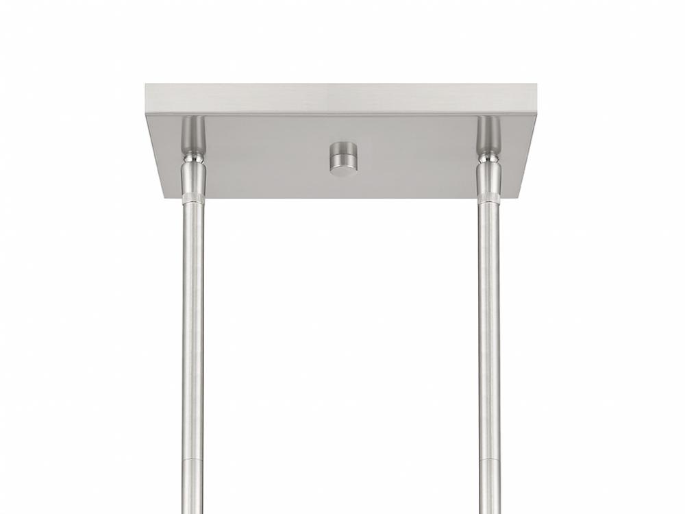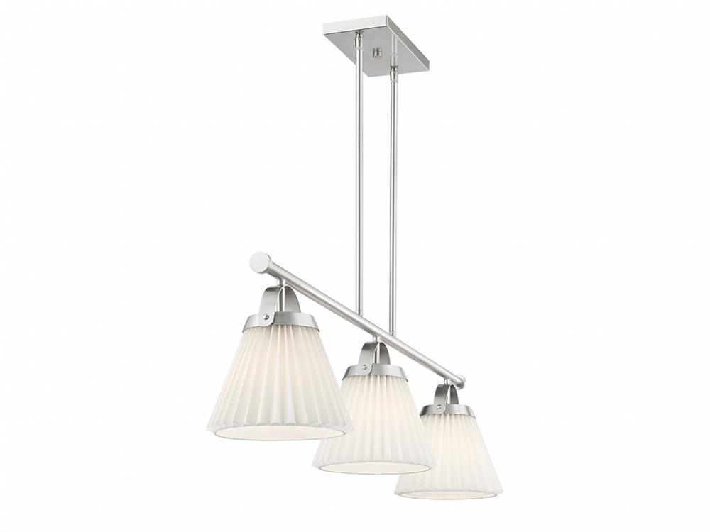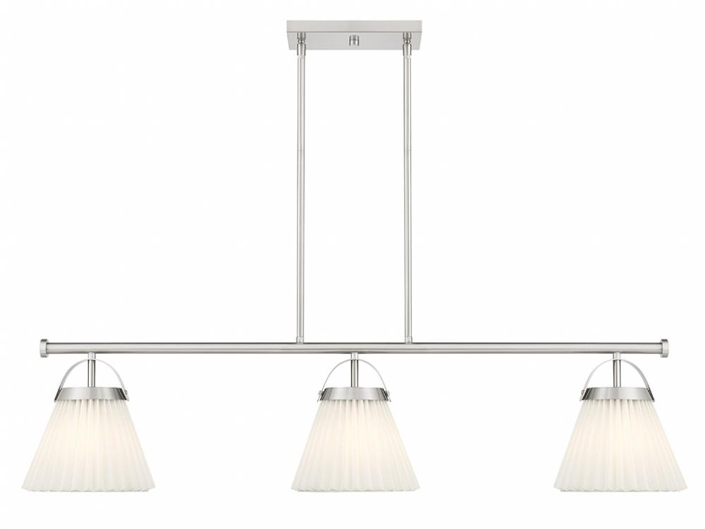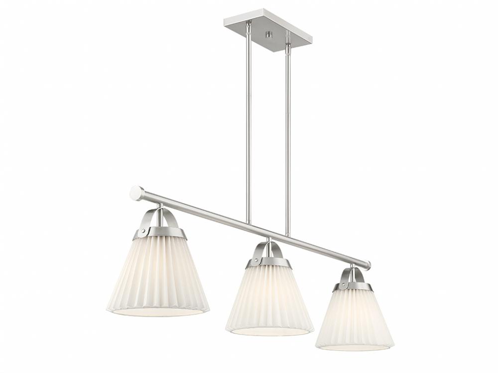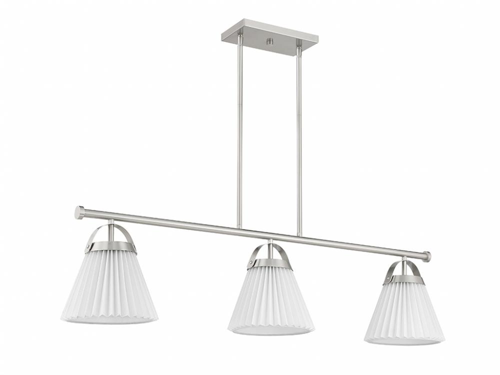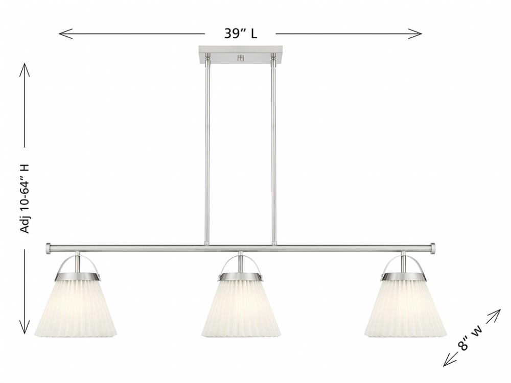 Add a prim and polished lighting look to kitchen islands, dining rooms, billiards rooms or any other stylish spaces with this 3-light linear chandelier. White knife-pleat shades pair nicely with the Brushed Nickel finish and look sharp whether the lights are on or off. This linear chandelier is 39" in length, 8" in width and has an adjustable height ranging from 10" to 64". It comes with eight 12" downrods and two 6" downrods. Uses 3 standard size bulbs of up to 60 watts per bulb. Bulbs not included.