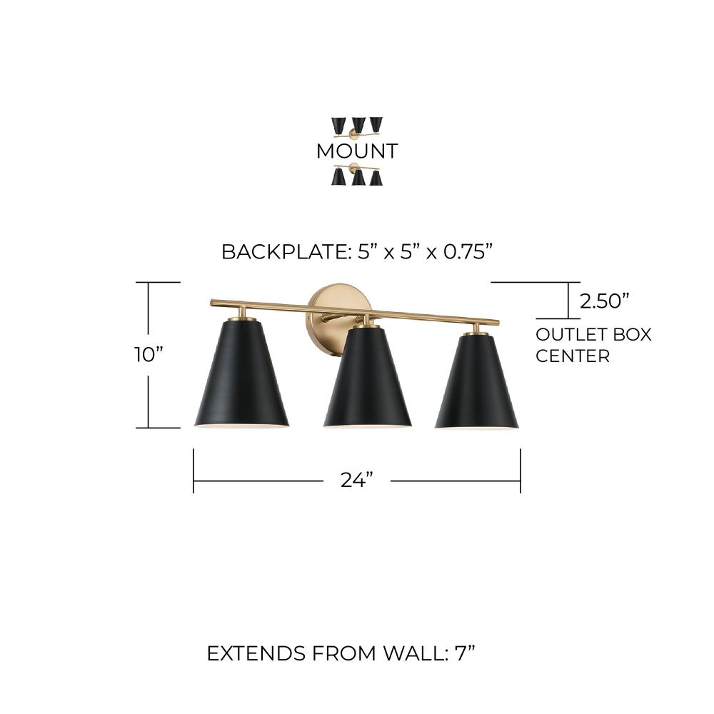 Featuring sleek metal shades and Matte Brass details, the Charlie 3-Light Vanity punctuates any powder room. The cone shape paired with the Matte Black finish delivers classic style all around.