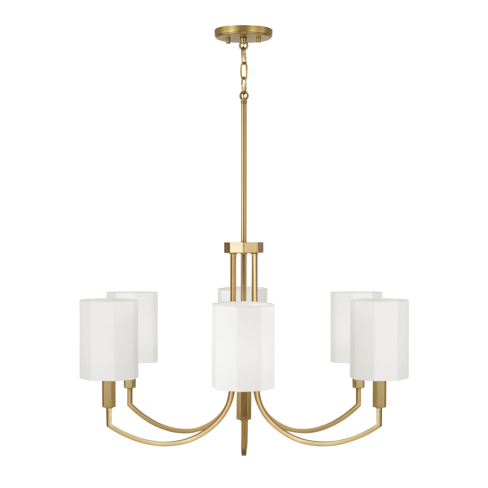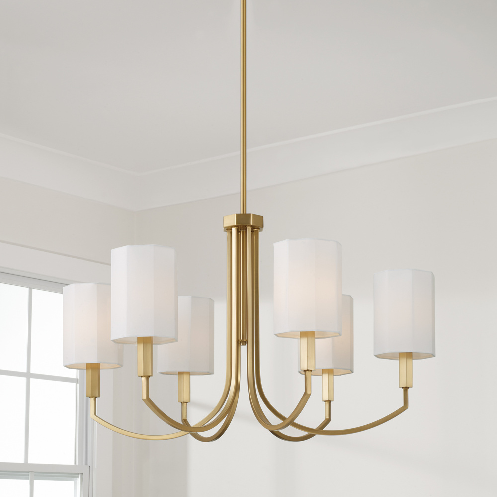 Geometrically inspired, the Adrian Medium Chandelier brings a structural silhouette with high style. The White fabric octagonal shades and faceted candle sleeves create striking dimension, while the Aged Brass finish adds a classic touch.