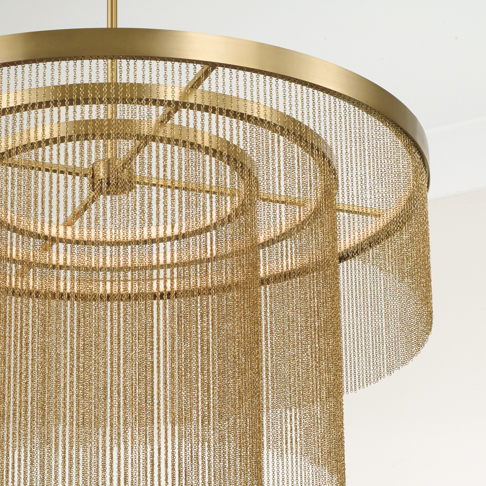 DETAILS: Delicate chain adornments dangle in cascading lengths from two nestled rings, lined with integrated LEDs for elegant illumination against the Aged Brass finish.