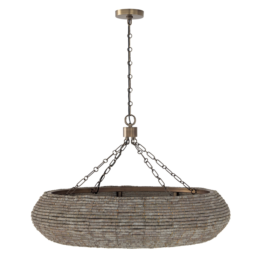 DETAILS: With thousands of hand-strung wooden beads, the curved drum ring silhouette takes on a stunning dimensional appeal, complete with an inner Soft White glass globe and an Aegean Grey finish.