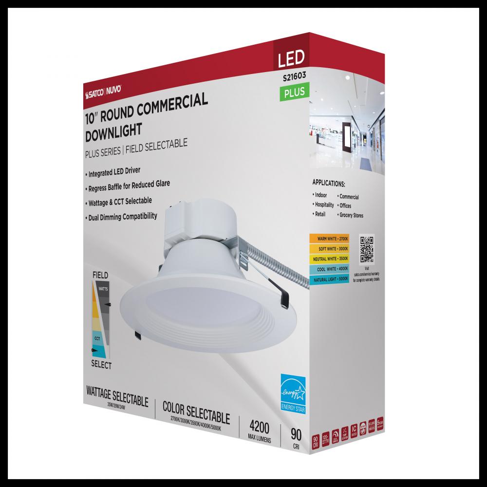 SATCO NUVO's Plus Series LED Commercial Downlight, S21603, delivers exceptional performance and versatility for today's remodel or new construction commercial environments. This 10-inch round fixture features field-selectable wattage and CCT settin