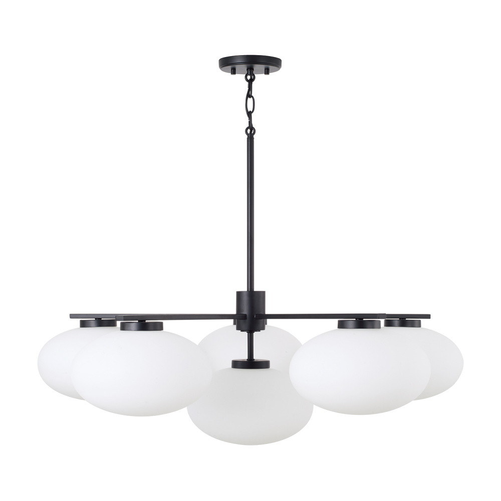 Create a serene aesthetic with the Soren Large Chandelier. Appearing almost weightless, the Soft White glass ovals illuminate a harmonious, ambient glow. The Matte Black finish perfectly punctuates the crisp lines and sleek details.