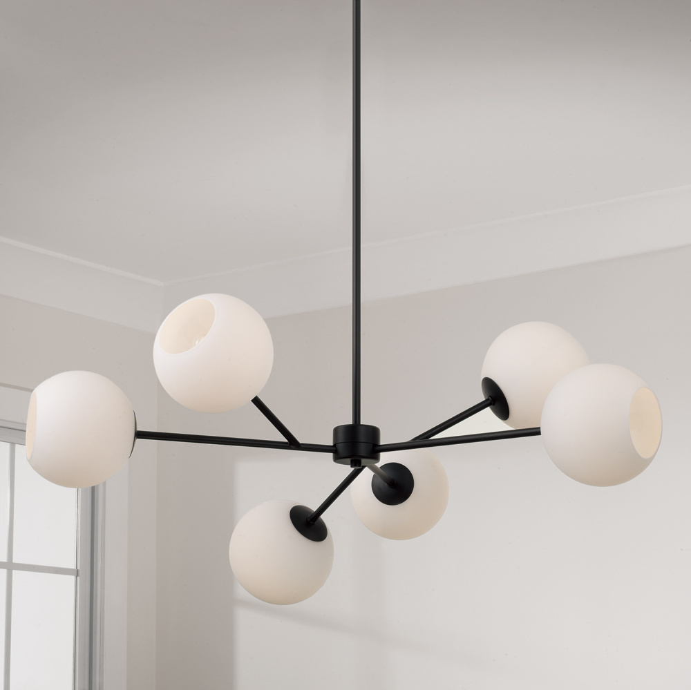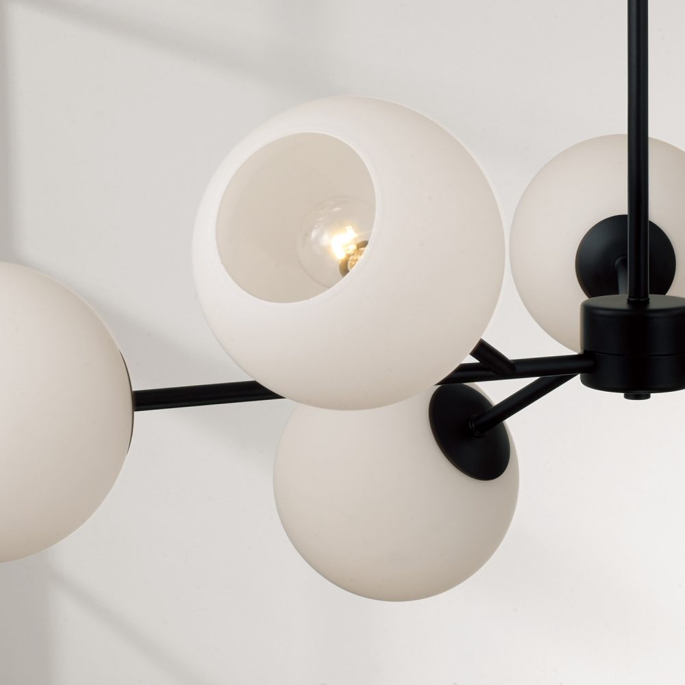 The Atlas Chandelier combines modern structure with asymmetrical balance. The open globe Soft White glass shades look almost effervescent on the sleek, juxtaposed arm branches. Finished in Matte Black for a contemporary aesthetic.