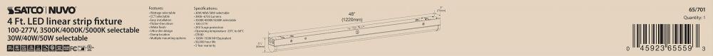 SATCO NUVO's 65-701 4-foot LED Linear Strip Fixture offers adaptable lighting for diverse applications. This field-selectable fixture provides wattage options of 30W, 40W, or 50W and color temperature settings of 3500K, 4000K, or 5000K. With a universa