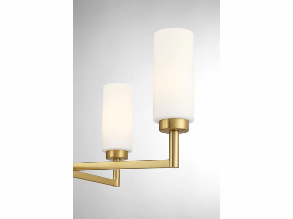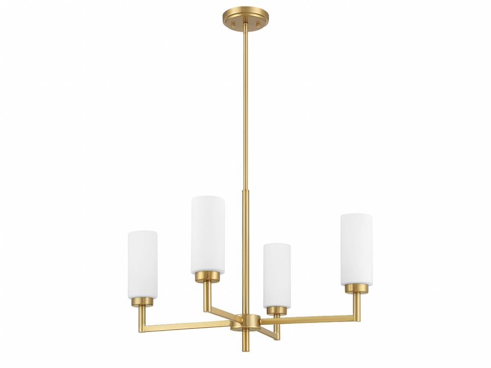 Get glowing with this angular, stylish 4-light chandelier. Each arm is finished in Natural Brass and holds a tall, sleek cylinder of white opal glass for bright yet flattering light. This chandelier is 26" in width and has an adjustable height ranging from 17" to 71". It comes with four 12" downrods and one 6" downrod. Uses 4 candelabra size bulbs of up to 60 watts per bulb. Bulbs not included.