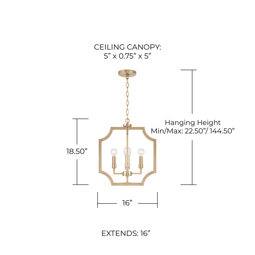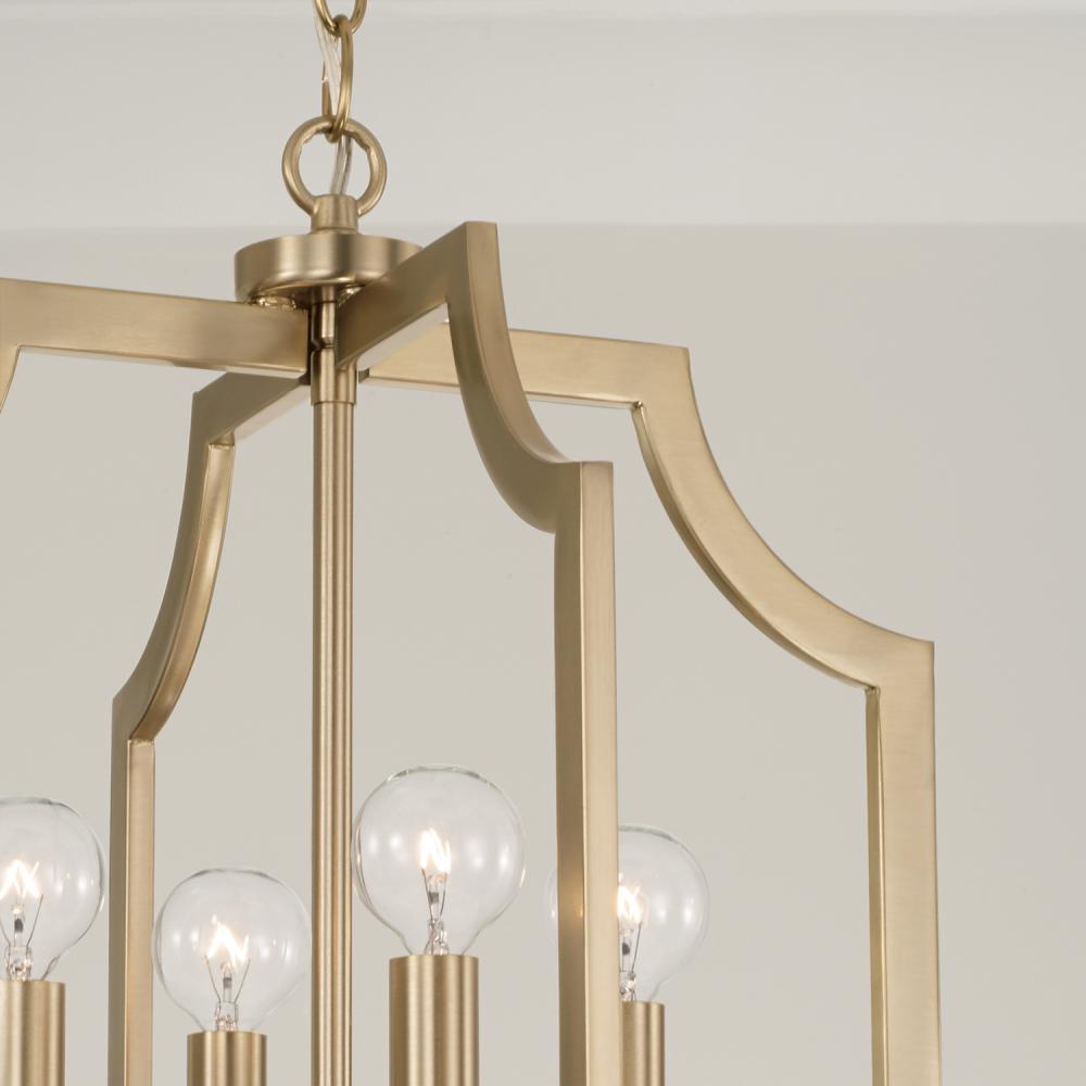 With the open, airy silhouette, the Courtney Lantern Foyer Pendant brings a charming aesthetic that doesn't overpower. The curved corners add chic appeal, while the Matte Brass finish gives a nod to mid-century modern style.
