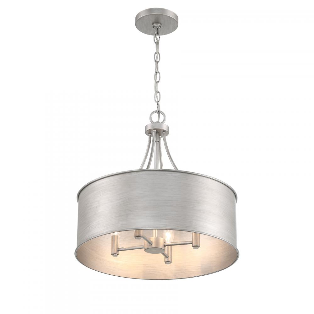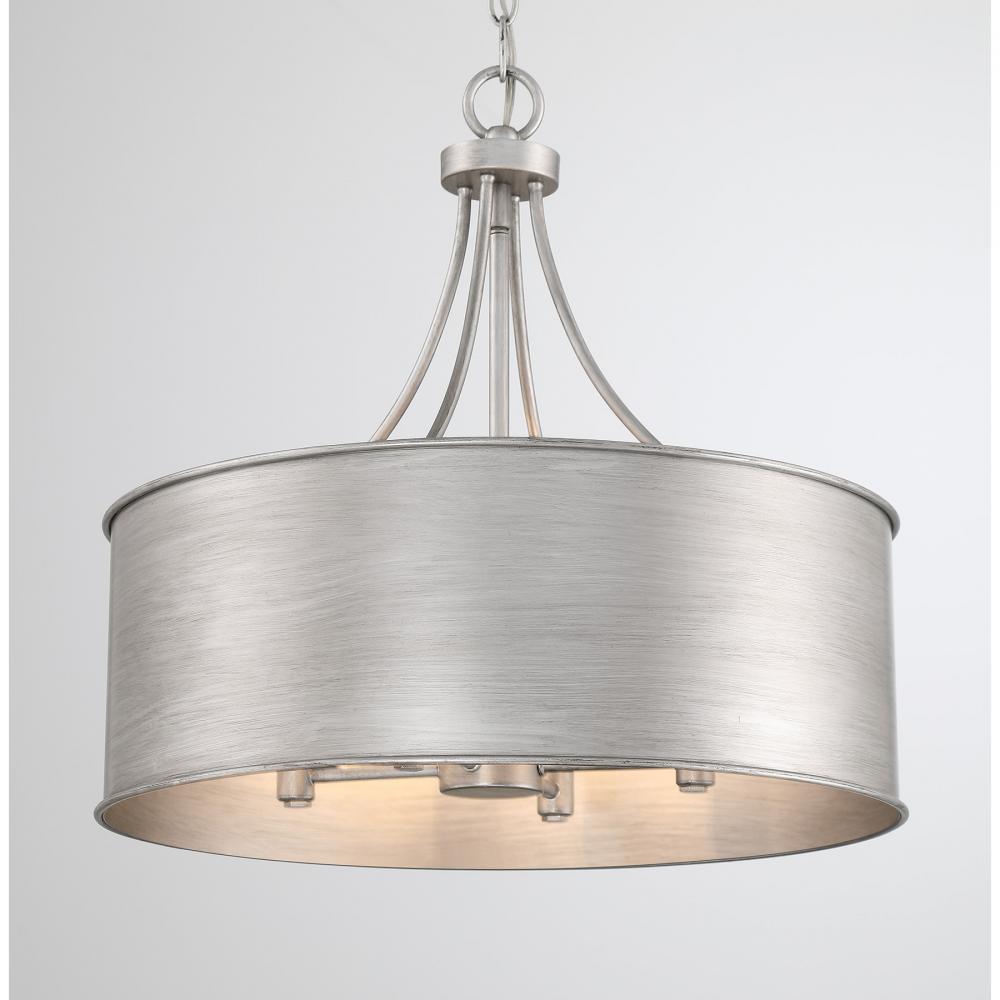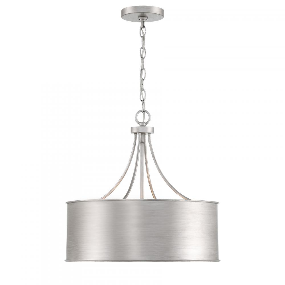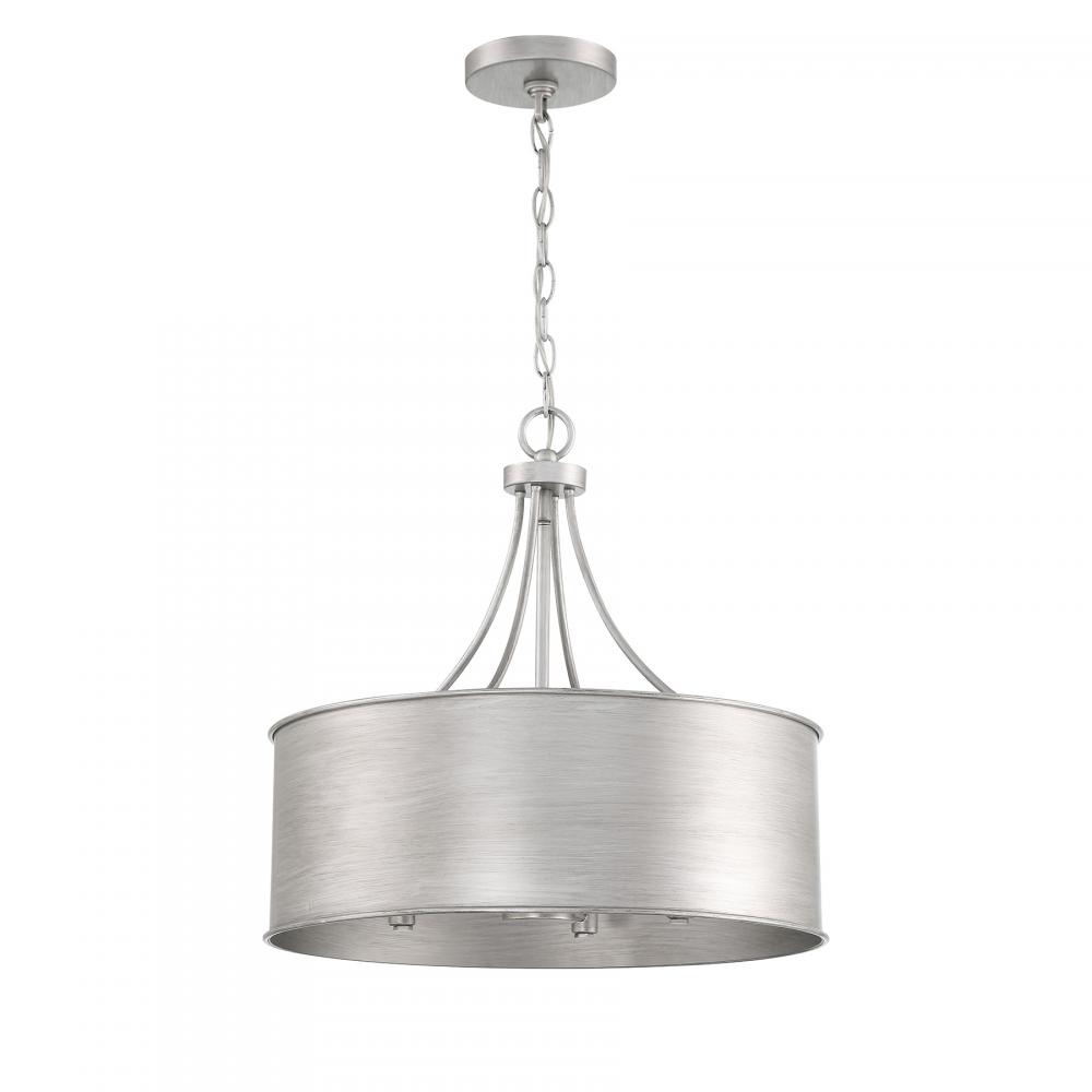 This 4-light pendant is the perfect way to bring timeless allure to any space. The drum-shaped solid metal shade, finished in Antique Silver, creates an eye-catching and appealing glow. 17.5" height and 18" width. Uses candelabra size bulbs, max 60 watts per bulb. LED bulb compatible. Comes with 120" of chain.