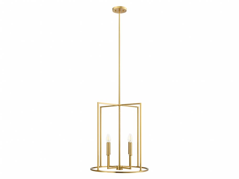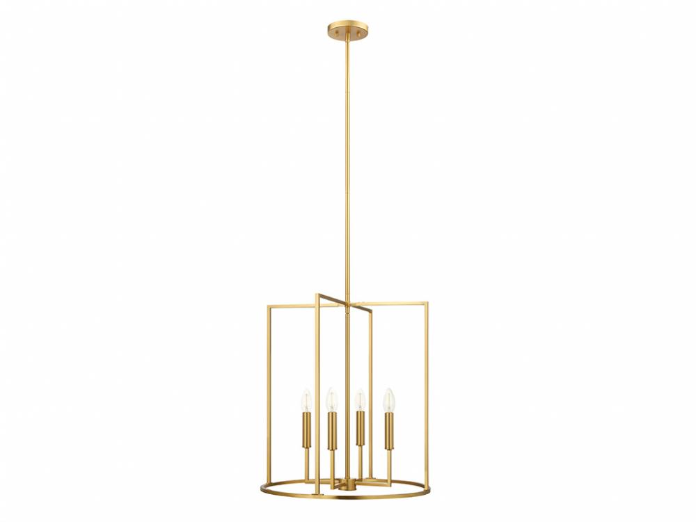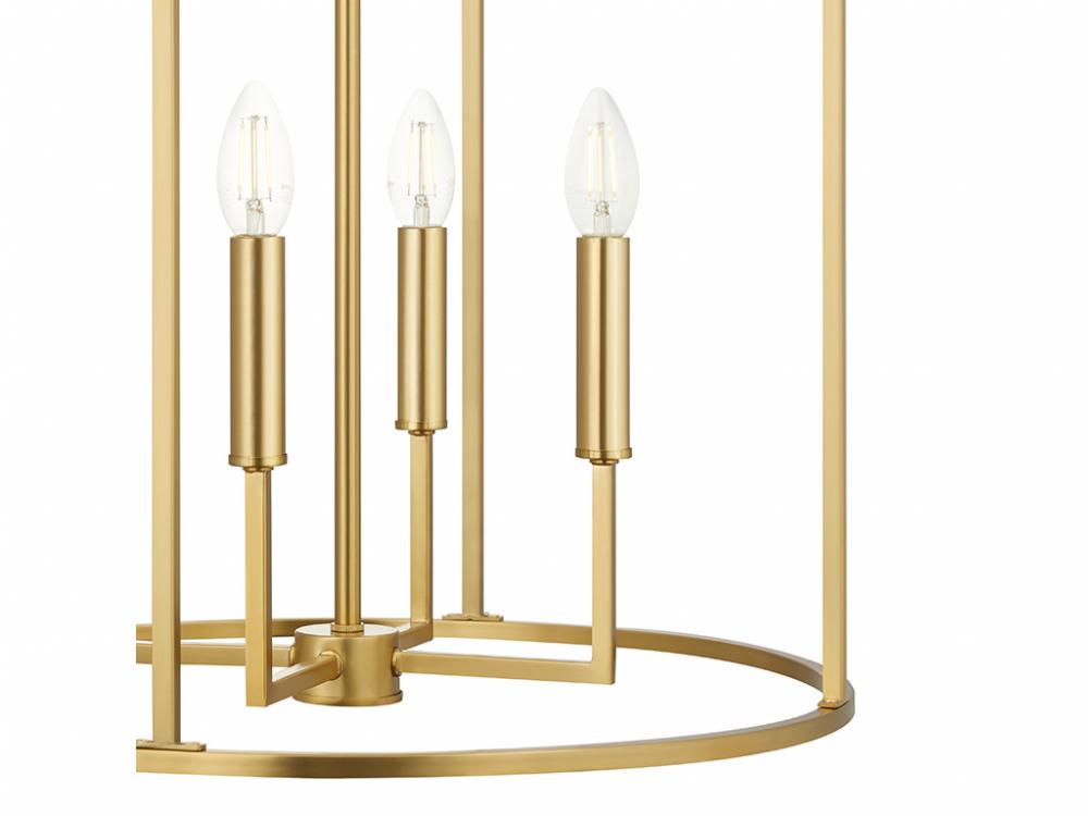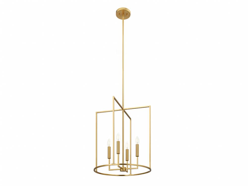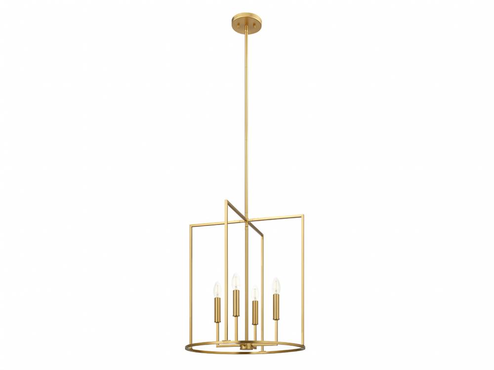 This tall, cylindrical 4-light chandelier has an airy structure that expertly combines sharp and round angles and is finished in Natural Brass. It is 21" in height and 19" in width. Uses four candelabra size bulbs of up to 60 watts per bulb. Bulbs not included.