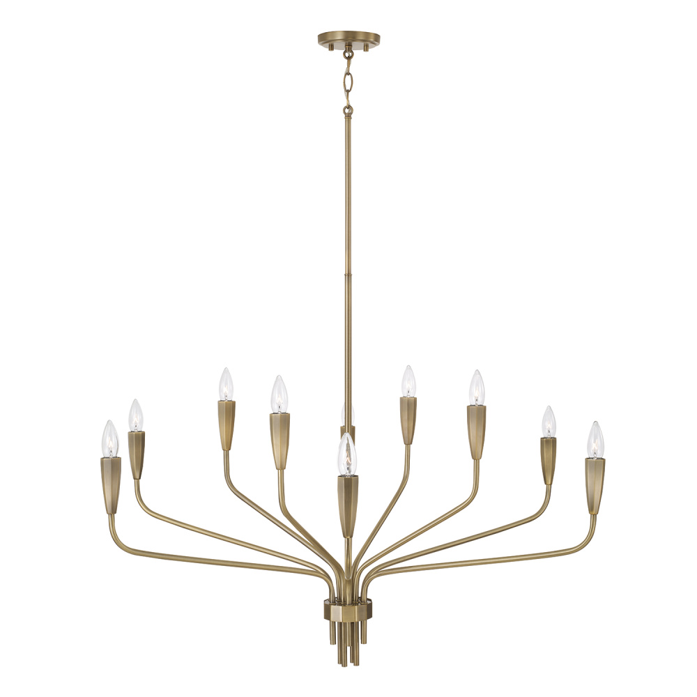 The Palmer Large Chandelier is all about finesse. The rich, Antiqued Brass finish adds a layer of complexity, while the softly faceted candle sleeves reflect the light at different angles, creating subtle dimension and intrigue. The gathered finial brings striking style to beautifully complete the design.