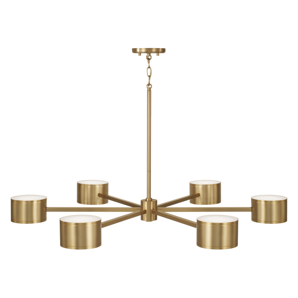 The Henley Large Chandelier delivers modern functionality in a sophisticated silhouette. Housed by concise cylindrical forms, the integrated LEDs offer simultaneous up and down light, while the Aged Brass finish creates stunning shine from every angle.