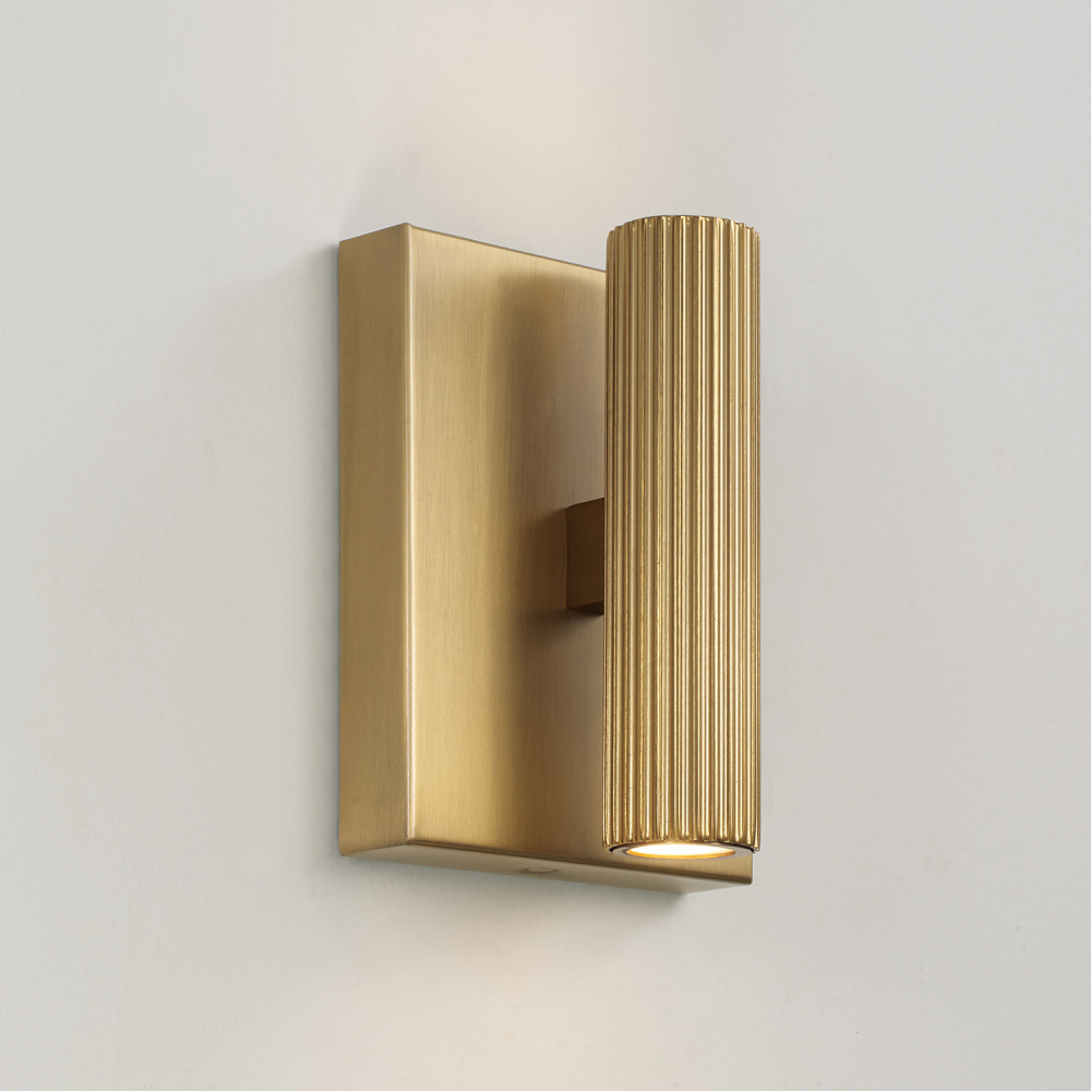 DETAILS: The fine, fluted texture brings dimension to the sleek, cylindrical form, complete with a full backplate and integrated LED technology for beautiful, functional task lighting in an Aged Brass finish.