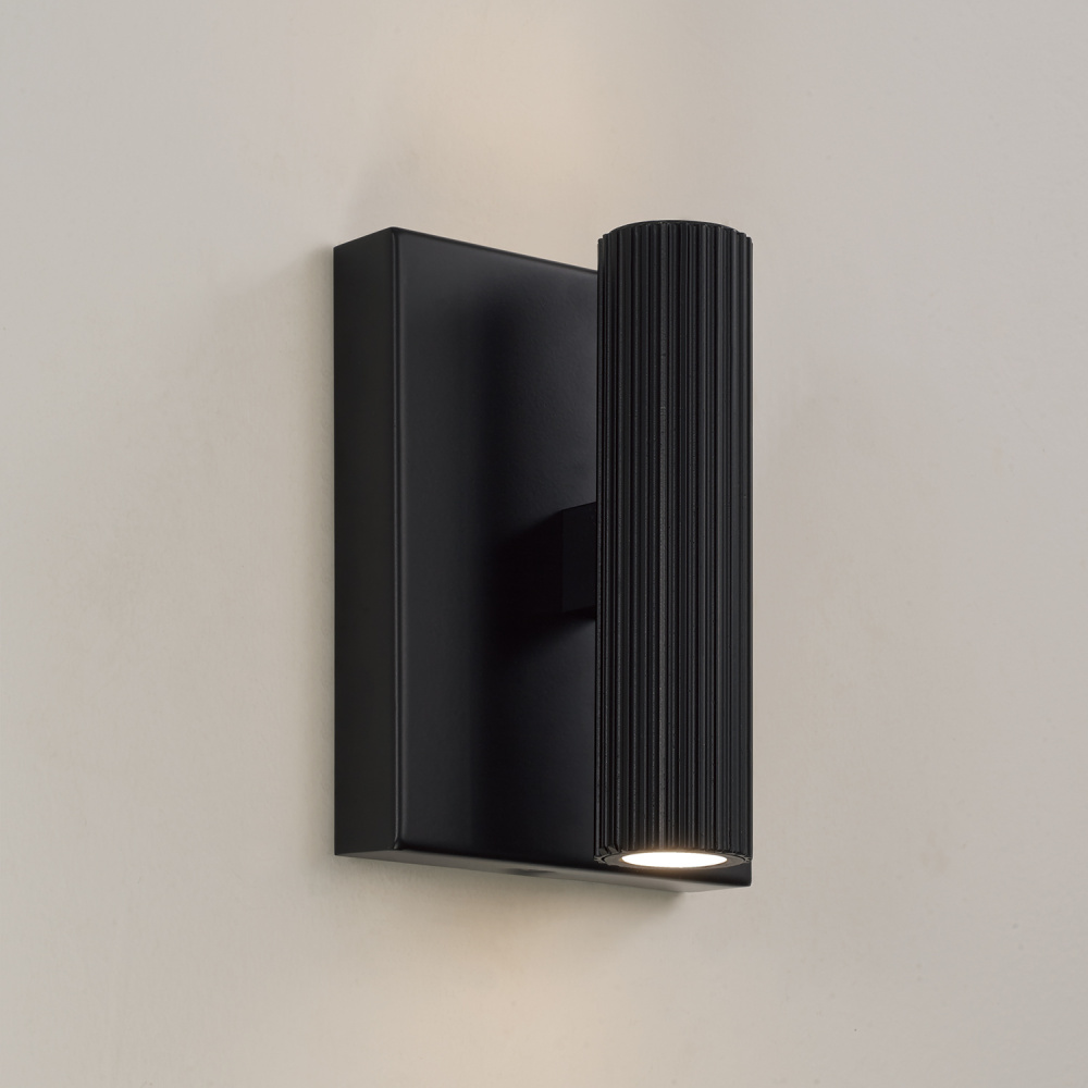 DETAILS: The fine, fluted texture brings dimension to the sleek, cylindrical form, complete with a full backplate and integrated LED technology for beautiful, functional task lighting in a Matte Black finish.