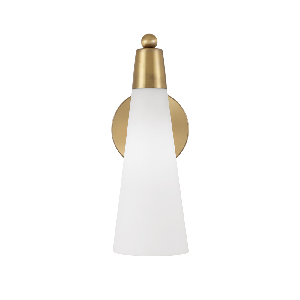 Sophisticated and chic, the Tess Sconce exudes elegance with sleek curves and thoughtful design. Punctuated by a dot detail at the top and canopy connection, the Aged Brass finish adds brushed visual texture to the sconce, while the Soft White glass creates a beautiful ambient glow in the slender, tapered shade.