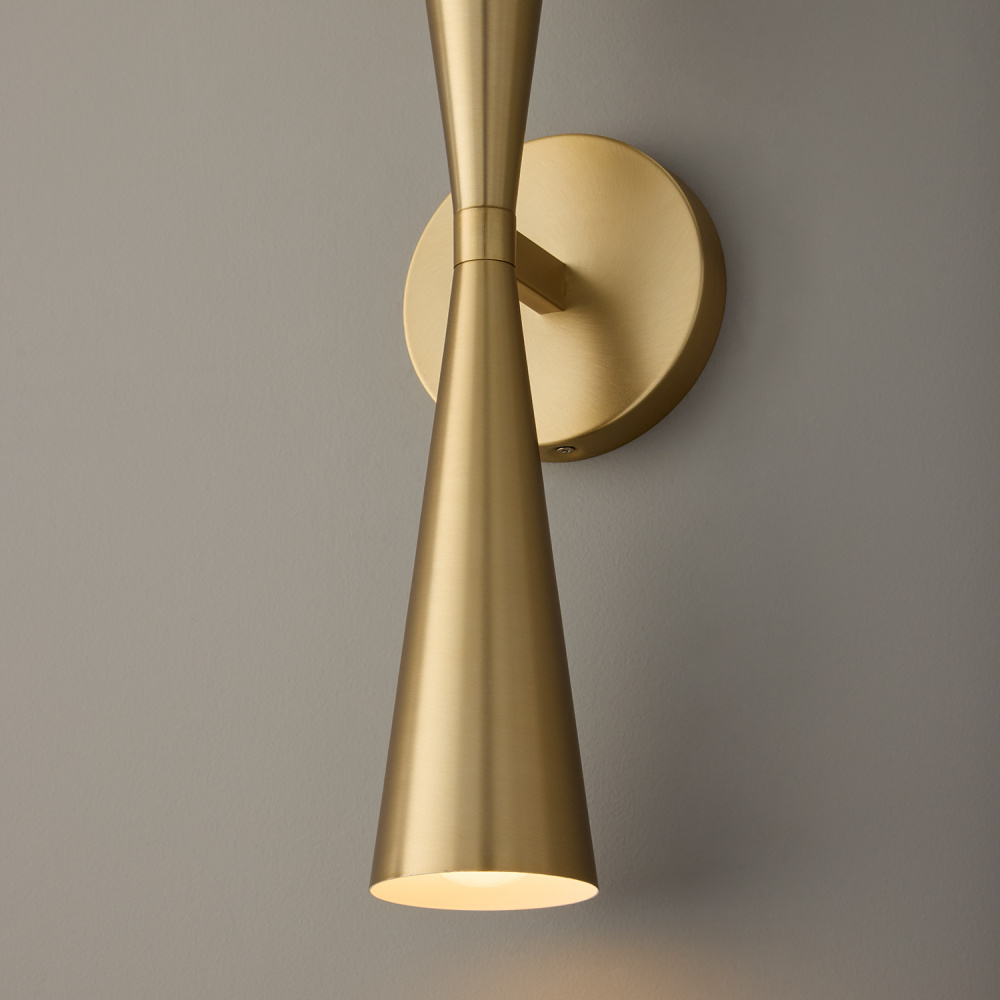 Sophisticated and streamlined, the Levi Dual Sconce brings sleek design to wall spaces. The elongated, hourglass silhouette embraces a less-is-more aesthetic, while the Matte Brass finish creates classic, elevated shine.