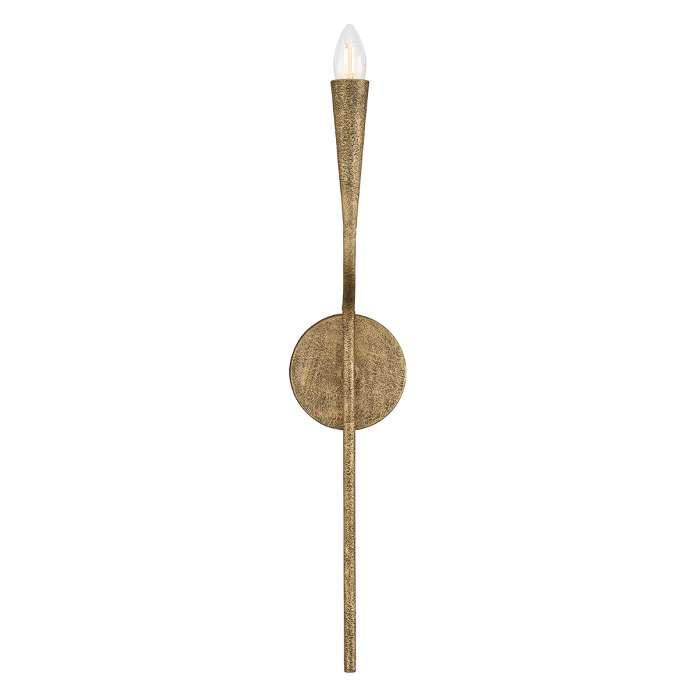 Designer details and a handcrafted finish form the Savari Sconce. A smooth transition between arm and candlesleeve gives this luminaire a seamless look, complemented by the elevated aesthetic of the slightly sunken socket. With layers of hand-painted texture, the Artisan Gold finish creates captivating dimension at every glimpse.