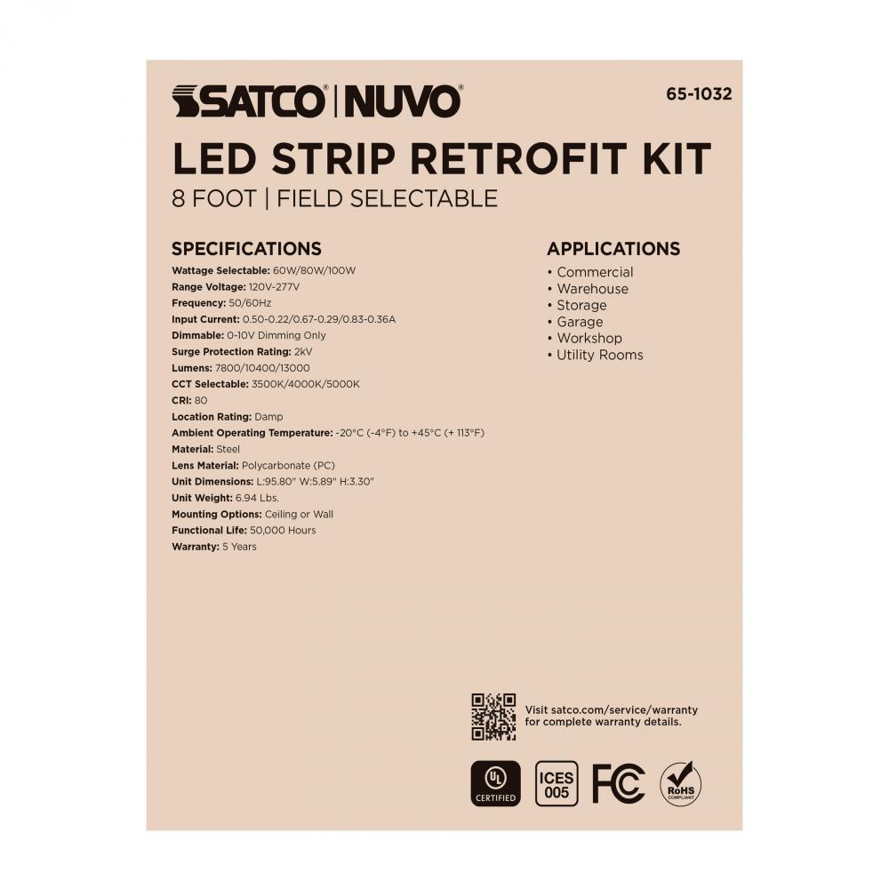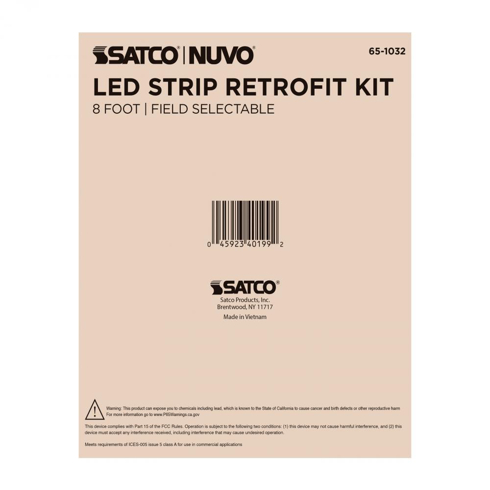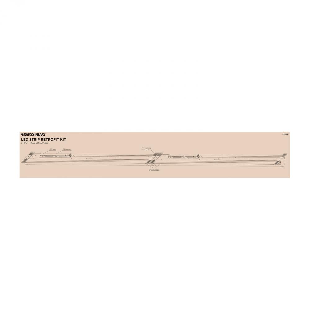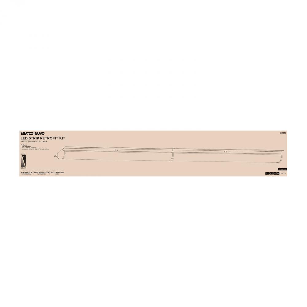 SATCO NUVO's LED Strip Retrofit Kit, 65-1032, is an energy-efficient upgrade for existing fluorescent fixtures. Designed with adjustable mounting strips to fit housings 2.75"–5.25" wide, this 8ft kit features field-selectable CCT and wattage,