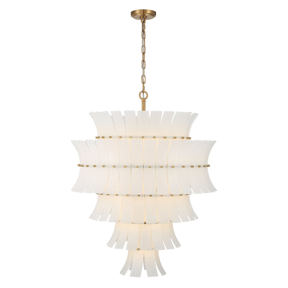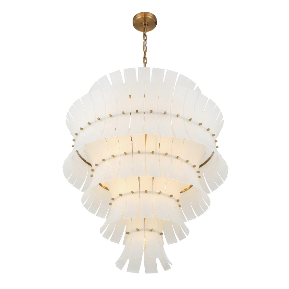 The Abigail Collection features tiered, curved panels of thick, hand-applied art glass arranged in a sculptural silhouette. Each textured glass piece is mounted to a structured metal frame and carefully shaped to diffuse light while adding depth and dimension. Whether illuminated or not, it serves as an artistic focal point—its layered form and artisanal materials creating visual impact from every angle. With handcrafted detailing and a bold, statement-making profile, the collection suits both contemporary and transitional interiors.