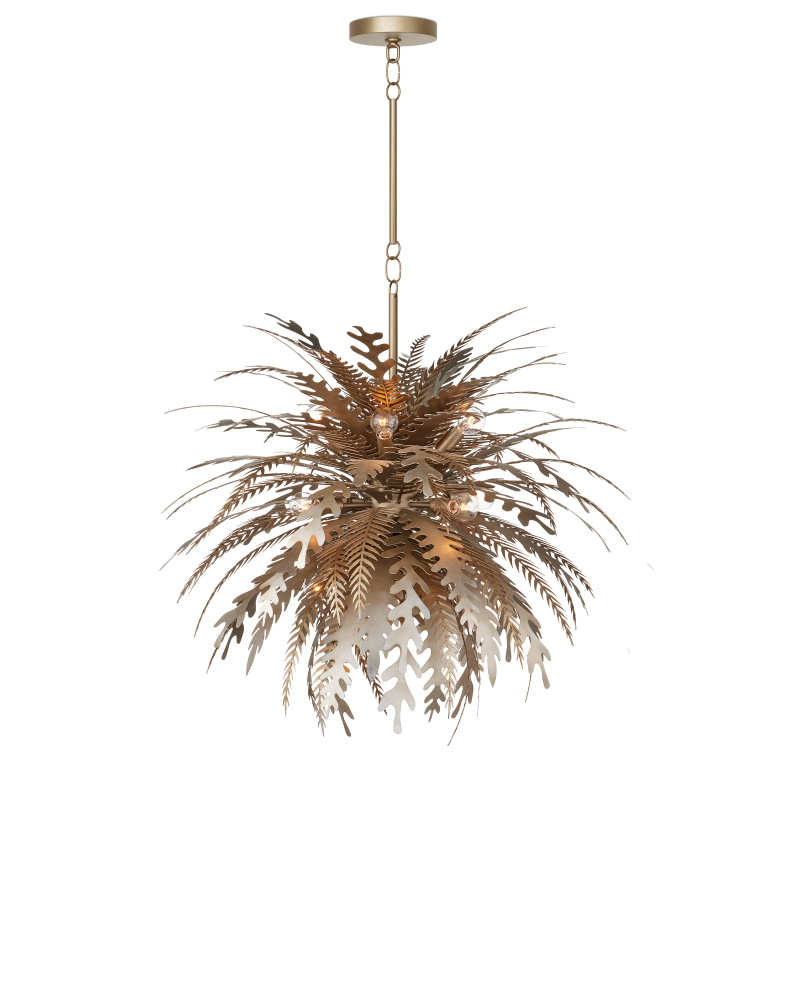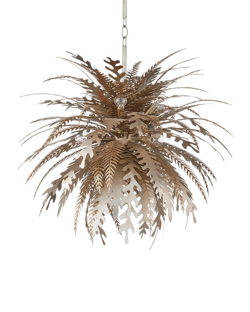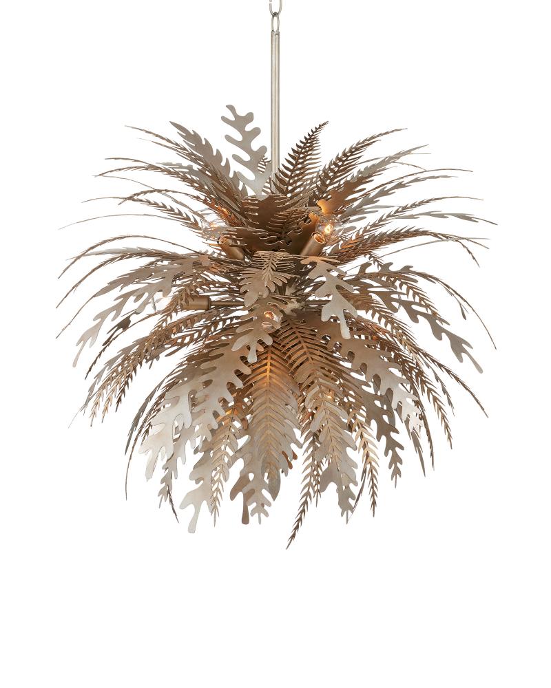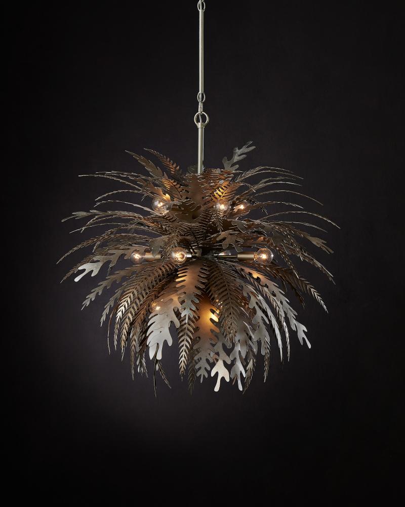 Wildly exuberant in its energy, the Abyssinia Chandelier is a sensational creation exploding with flora in varying wrought iron shapes. The organic, nature-inspired chandelier was seriously labor-intensive to create, as each of the leaves is individually laser cut and bent, then welded to a center core to mimic how a plant would grow from a planter. The intermingling of contemporary silver leaf and dark silver leaf finishes creates an even more intense sense of texture. The hanging rods are adjustable. Adjustable from 40" to 86" with use of included chain/rod kit/cable. If your space calls for a longer drop, additional chain/rods/cable is available for purchase.