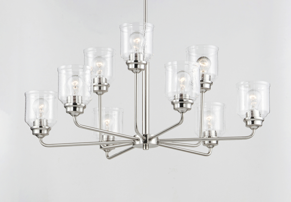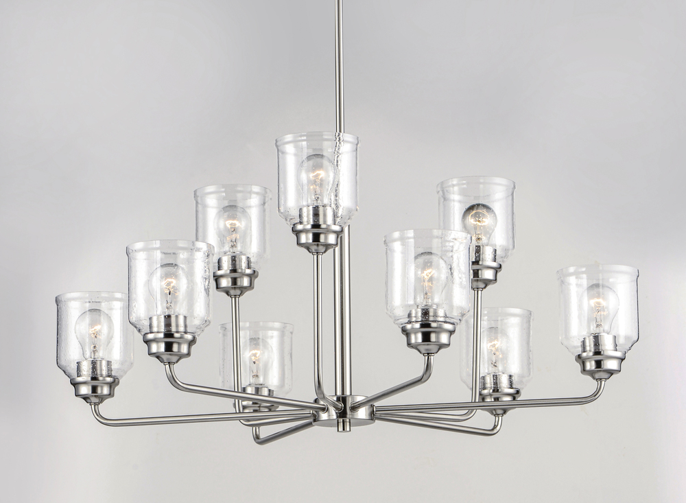 A modest frame of steel tubing gently bends to support a cluster of Clear Seedy bell-shaped glass. Similarly the bobeches and other metal accents echo that traditional bell shape creating an instant classic. An easy choice with transitional appeal, choose
