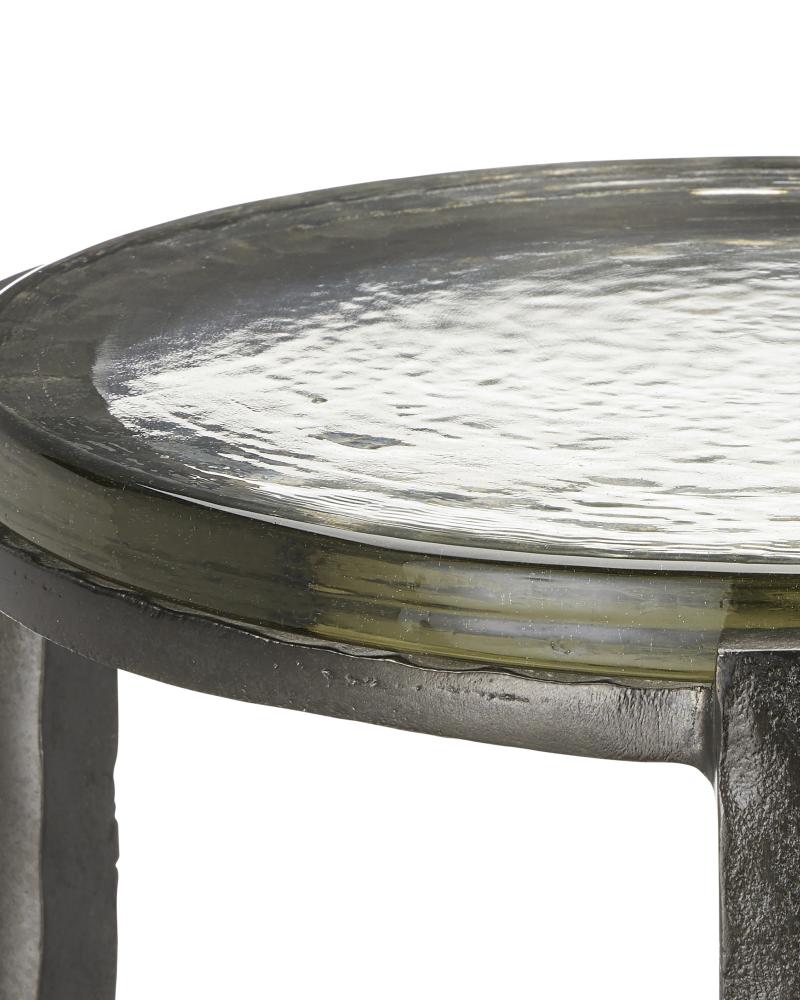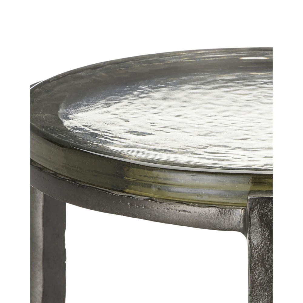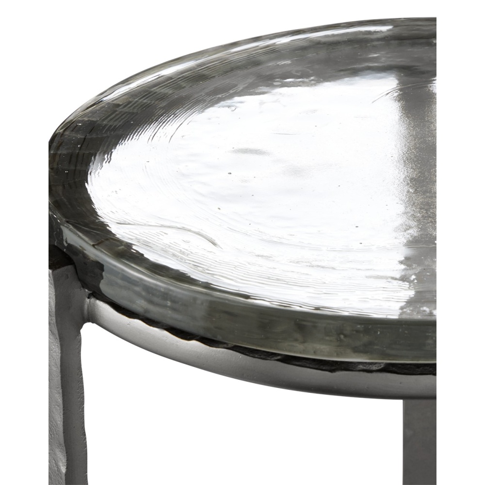 The point at which art and fine craftsmanship meet is where the Acea Graphite Drinks Table resides. Made of cast aluminum poured into a hammered mold to create even greater texture, the silver drinks table is topped with a cast glass disc that is equally textural and luminous. This table will be a piece of jewelry in a space.