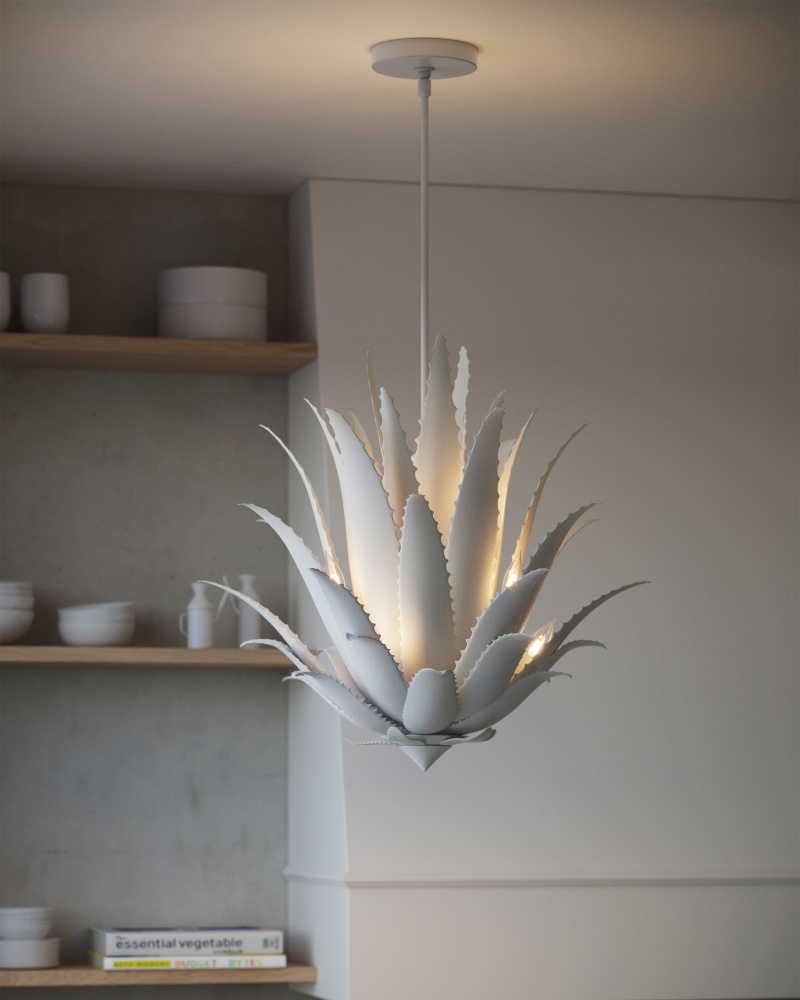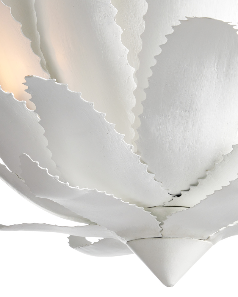 The Agave White Chandelier was inspired by the flourishing plant of the same name, whose spiky, leathery fronds curl up from the ground. This sense of movement has been captured in the flowing spikes on this white chandelier. “My love of the Agave plant, of which hundreds of varieties flourish in the peninsula, has inspired me for many years,” says the fixture’s designer Marjorie Skouras. Her passion for the Yucatan shines through in this wrought iron creation covered in a crisp gesso white finish. Adjustable from 31" to 73" with use of included chain/rod kit/cable. If your space calls for a longer drop, additional chain/rods/cable is available for purchase.