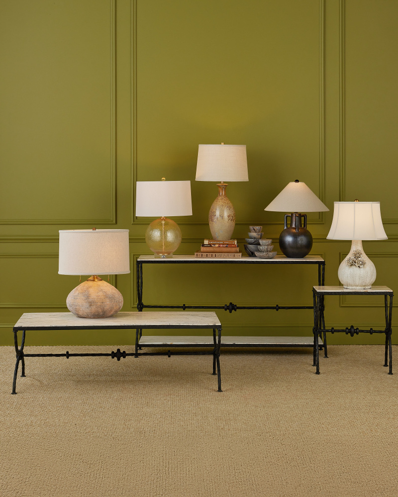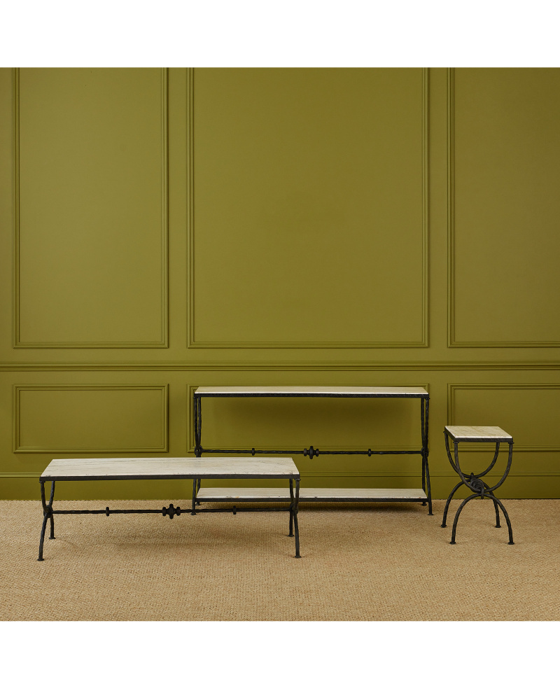 The Agora White Travertine Cocktail Table draws inspiration from classical Greek design. Its white travertine top has dynamic veining that adds natural texture to the piece. The hourglass-shaped legs give the table a sculptural presence, while a stretcher with decorative orb detailing adds an extra layer of interest. Finished in a rich bronze, the metal frame contrasts beautifully with the light color of the stone, which will vary from piece to piece.