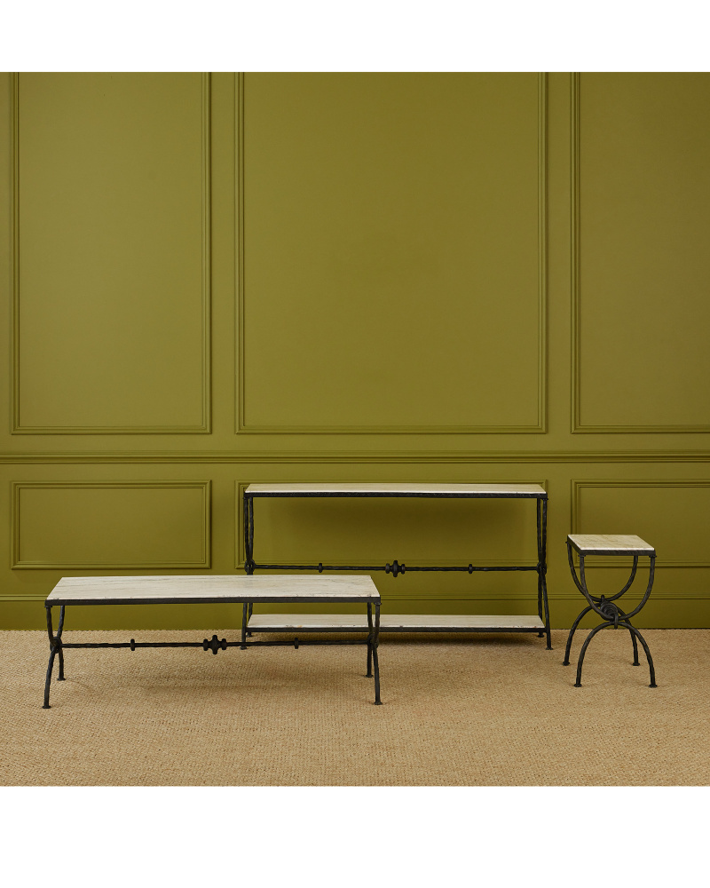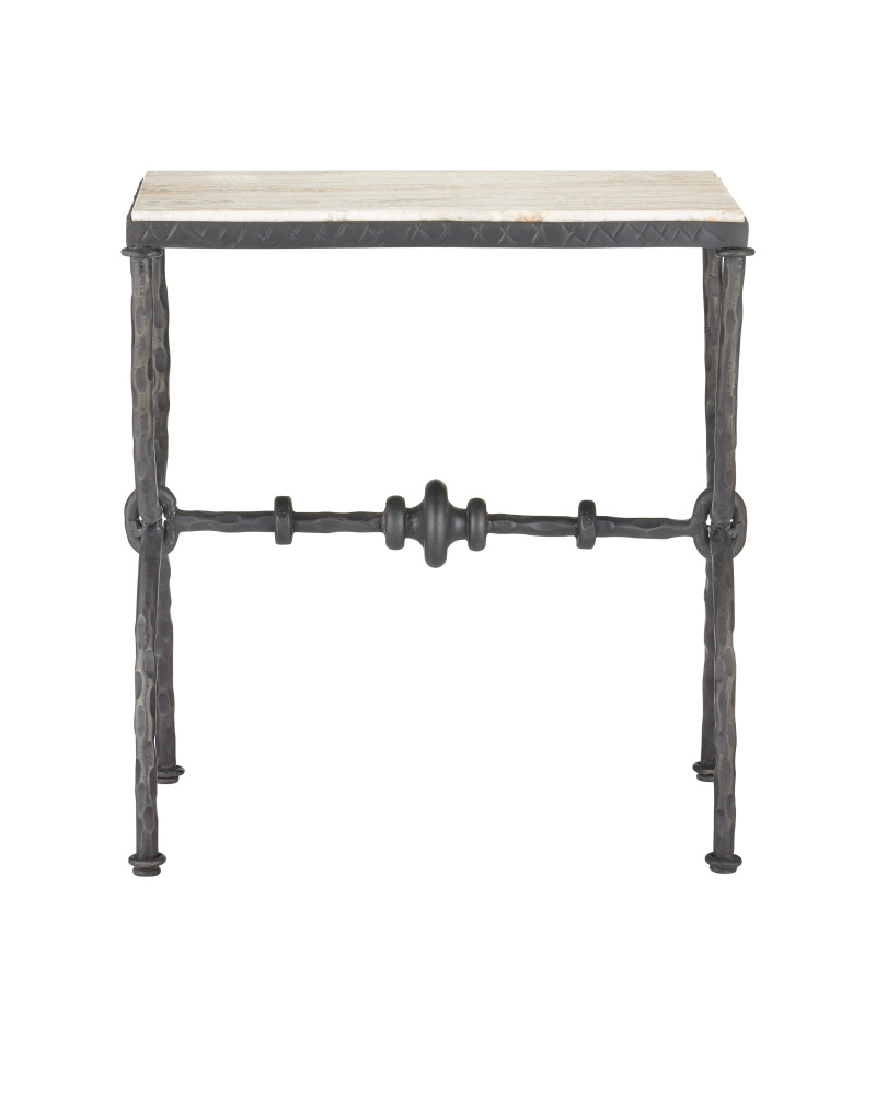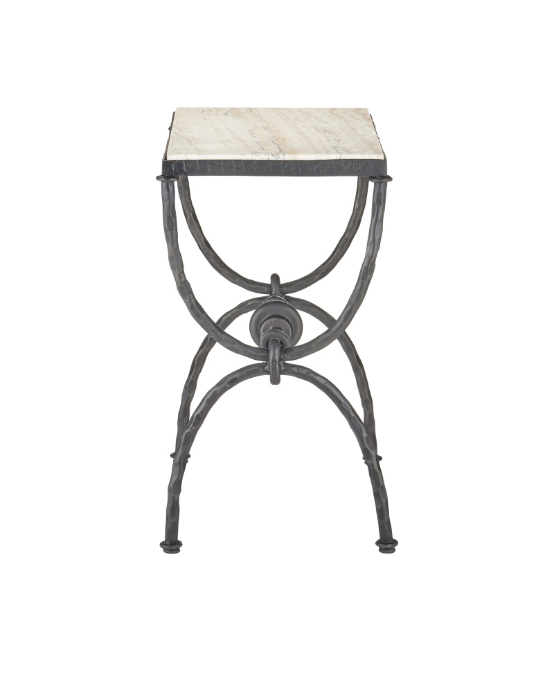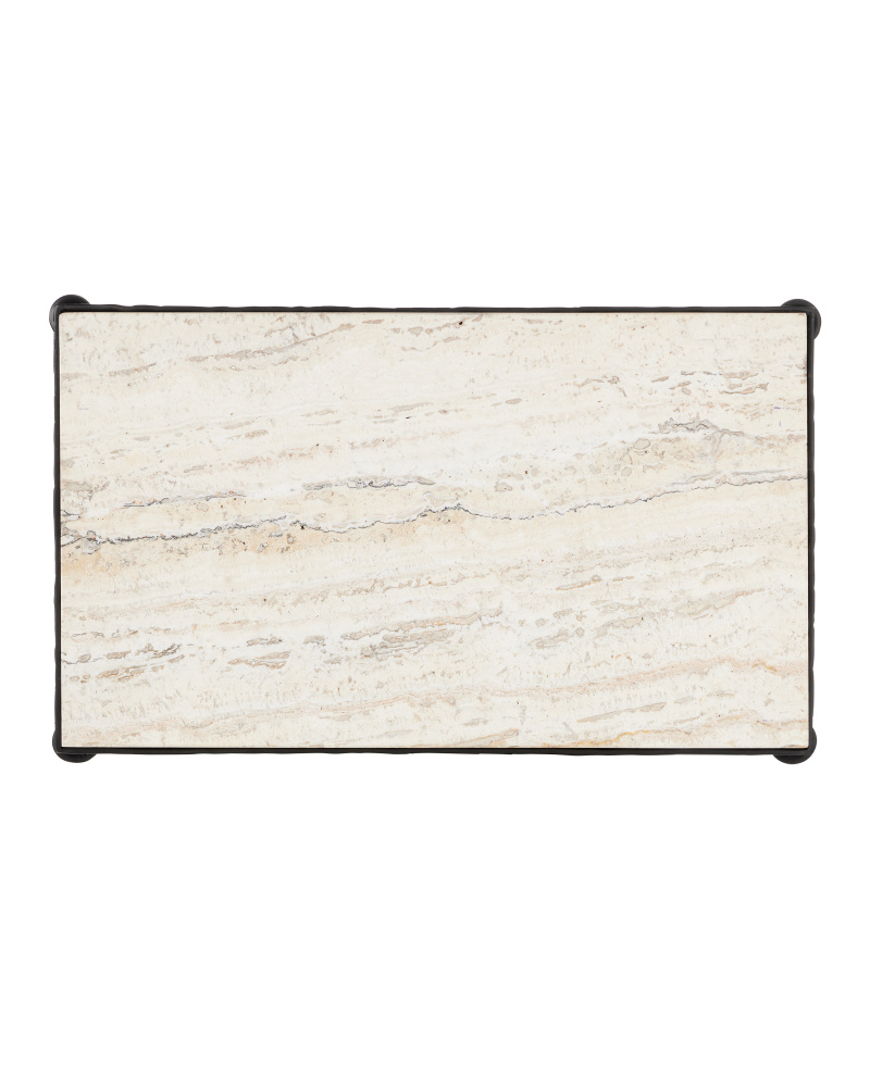 The Agora White Travertine Side Table draws inspiration from classical Greek design. Its white travertine top has dynamic veining that adds natural texture to the piece. The hourglass-shaped legs give the table a sculptural presence, while a stretcher with decorative orb detailing adds an extra layer of interest. Finished in a rich bronze, the metal frame contrasts beautifully with the light color of the stone, which will vary from piece to piece.