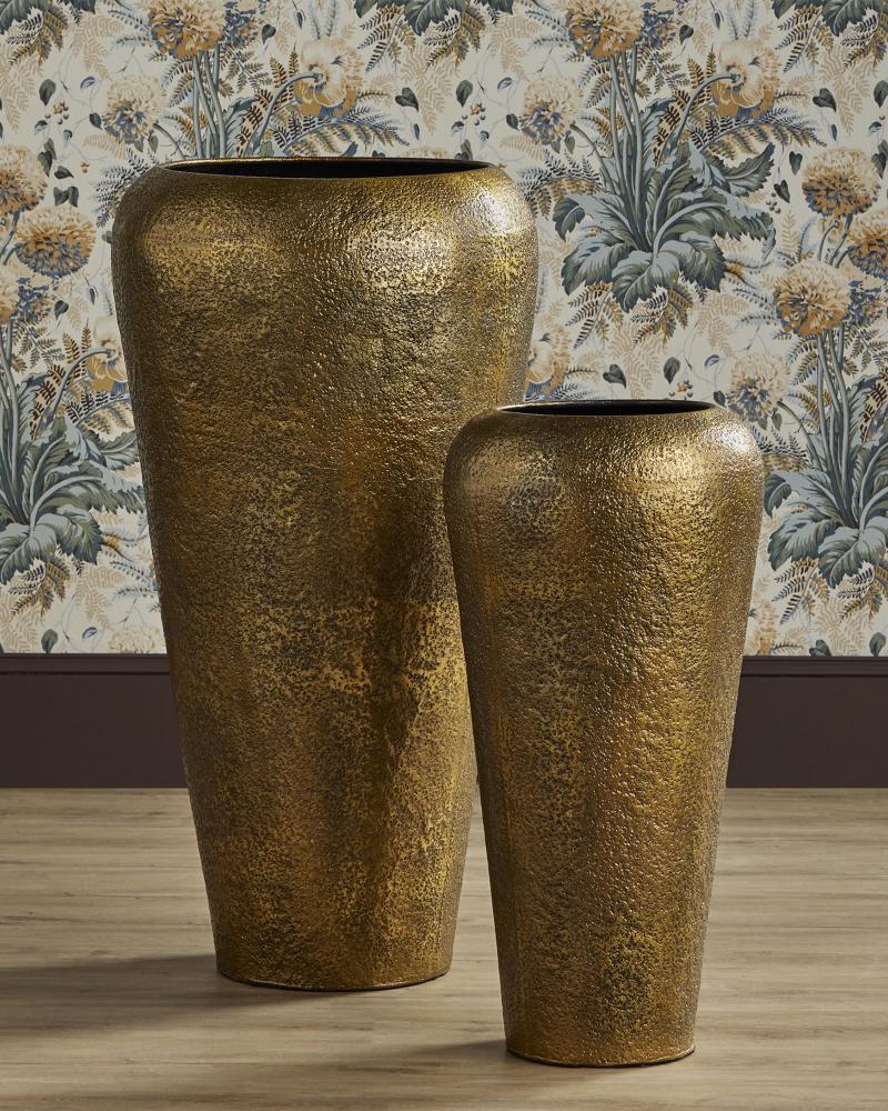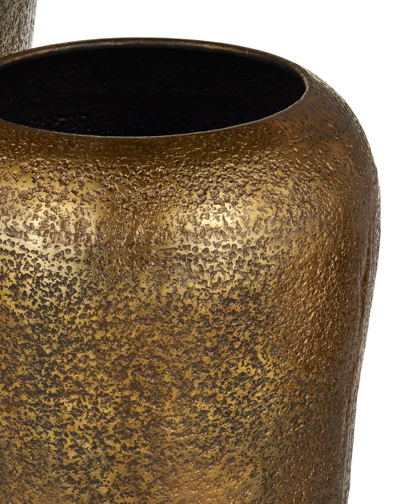 The Aladdin Vase Set includes two oversized vessels made of cast aluminum in an antique gold finish. The incredible amount of pitting on the surfaces combined with the drifts created when the finish gathers in crevices and is wiped away creates beautifully textured accents.