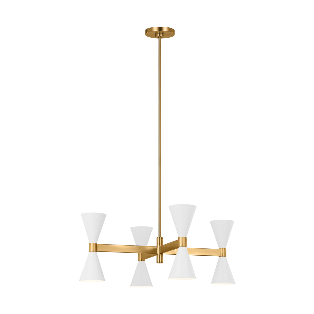 The Albertine chandelier by AERIN for Visual Comfort Studio Collection emits ample light above and below from eight conical lights on a crossed frame. This sophisticated piece provides a strong focal point in a large room and is a versatile style that works in both traditional and contemporary interiors. Ideal for a living room or above a dining table.