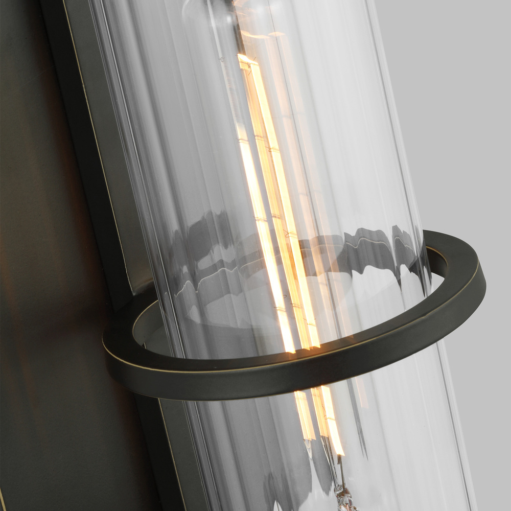 Clear fluted glass shades give the Alcona series a refined industrial look. The elegant square backplate and metal center ring provide a floating glass effect. The Alcona one light outdoor pendant fixture creates a warm and inviting welcome presentation for your home's exterior. Available in a handsome Black or Antique Bronze finish.