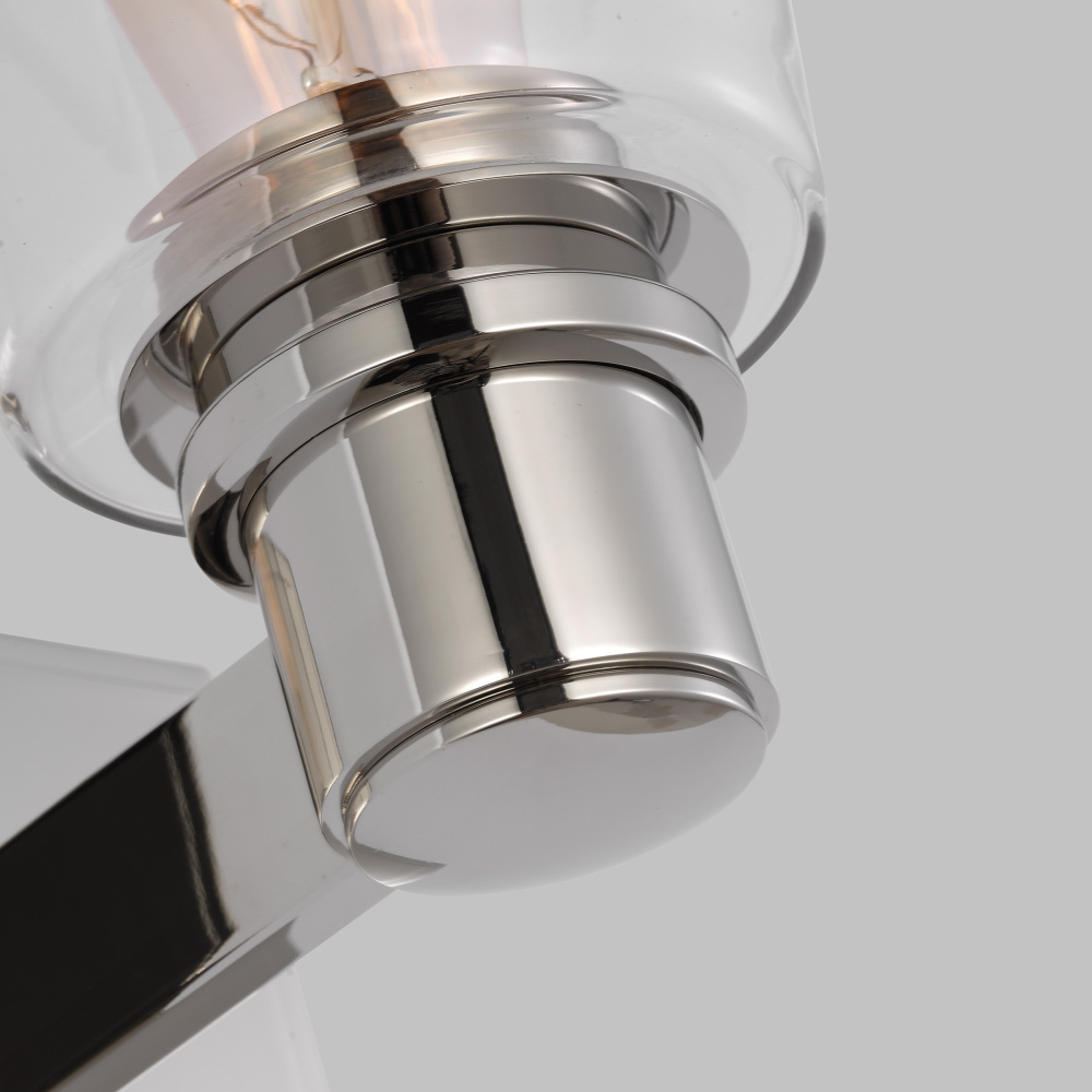 Designed by Chapman & Myers, the Alessa one light wall sconce in polished nickel is a Simple glass bathroom collection with rectangular metal arms and tapered clear glass shades. The conical clear glass shades replicate and frame the shape of the inner filament bulb. Each shade is supported by a rectangular metal arm and is capped with a thin metal rim.