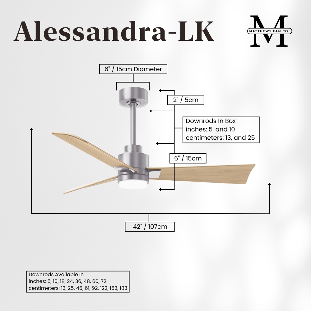 Minimal form with maximum efficiency. with a wide range of sizes, the Alessandra can accommadate any size space. This thoughtfully crafted and versatile fan will complement any aesthetic and improves the health and comfort of any room. Highly customizable, the Alessandra is available in 5 different body finishes, 7 blade options and even a color changeable light kit. Suitable for fully exposed outdoor areas. Backed by a limited lifetime warranty, our fans are of the highest quality and will dutifully perform for years to come.