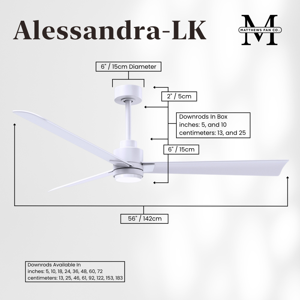 Minimal form with maximum efficiency. With a wide range of sizes, the Alessandra can accommadate any size space. This thoughtfully crafted and versatile fan will complement any aesthetic and improves the health and comfort of any room. Highly customizable, the Alessandra is available in 5 different body finishes, 6 blade options and even a color changeable light kit. Suitable for fully exposed outdoor areas. Backed by a limited lifetime warranty, our fans are of the highest quality and will dutifully perform for years to come.