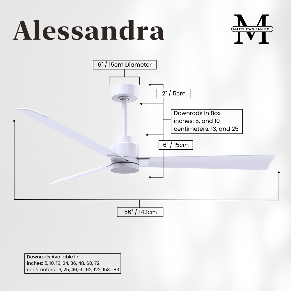 Minimal form with maximum efficiency. With a wide range of sizes, the Alessandra can accommadate any size space. This thoughtfully crafted and versatile fan will complement any aesthetic and improves the health and comfort of any room. Highly customizable, the Alessandra is available in 5 different body finishes, 6 blade options and even a color changeable light kit. Suitable for fully exposed outdoor areas. Backed by a limited lifetime warranty, our fans are of the highest quality and will dutifully perform for years to come.