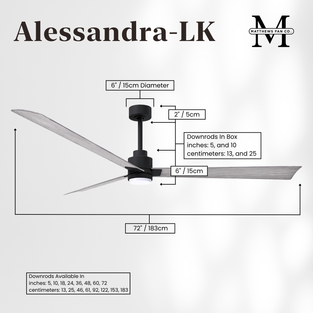 Minimal form with maximum efficiency. With a wide range of sizes, the Alessandra can accommadate any size space. This thoughtfully crafted and versatile fan will complement any aesthetic and improves the health and comfort of any room. Highly customizable, the Alessandra is available in 5 different body finishes, 6 blade options and even a color changeable light kit. Suitable for fully exposed outdoor areas. Backed by a limited lifetime warranty, our fans are of the highest quality and will dutifully perform for years to come.